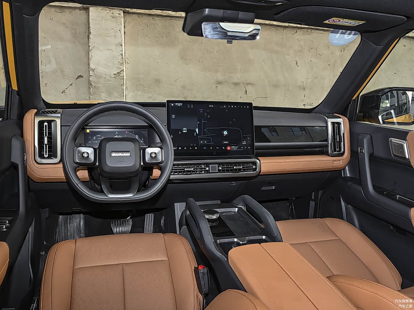 从新车的侧面设计来看,4545mm的车身长度和2783mm的轴距共同形成了短悬长轴的比例,而1950mm的车身宽度与21英寸的轮毂结合,实现了3.6:1的轮轴比例。这款车的侧窗采用了无框设计,黑色轮眉和侧裙的导流槽增强了车辆的越野能力,而悬浮式车顶则降低了视觉的重心。隐藏式门把手与航空铝质车顶行李架在功能和审美方面实现了一种平衡,其1600kg的拖挂规格能够满足户外扩展的需求。实际测试结果显示,后排座椅的腿部空间可以达到980mm,而头部空间则接近1m,这明显优于同级哈弗大狗的表现。