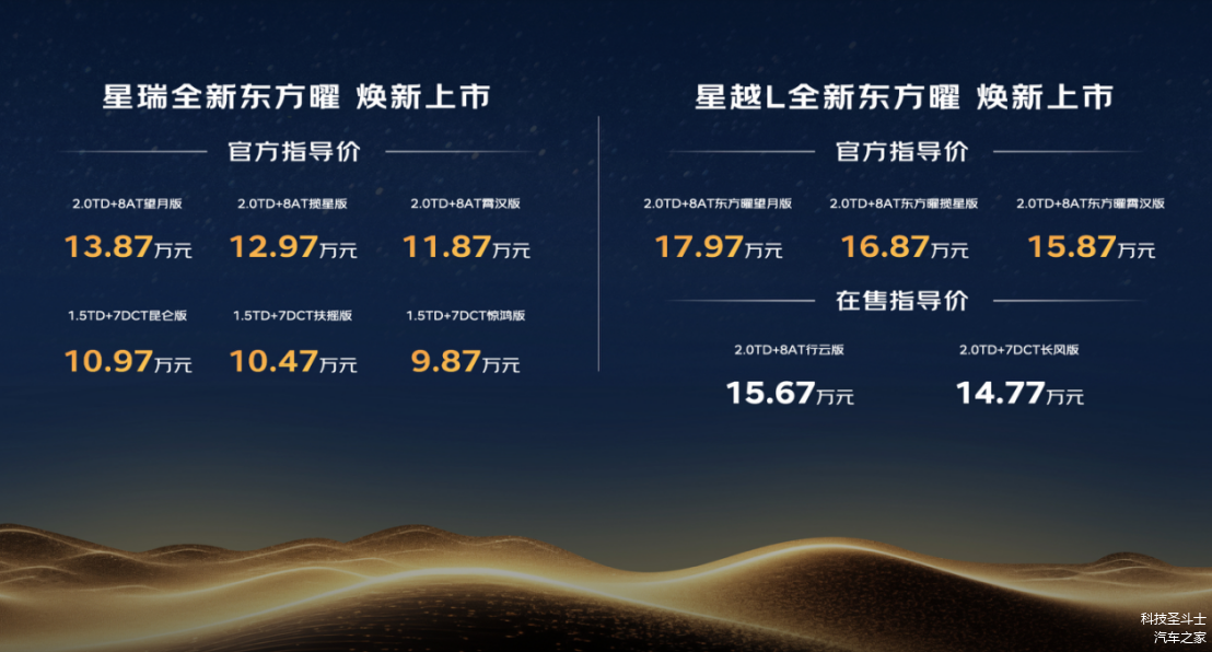 2025年9月23日,吉利中国星全新东方曜系列正式上市,实力派演员欧豪作为吉利中国星官方代言人,亲临现场,不仅首次公开演唱新歌《雨点》,还与总台主持人马凡舒温馨互动,全场齐唱《我和我的祖国》,为祖国献上深情的祝福,将现场气氛推向高潮。中国星全新东方曜以“中国设计、智能科技、极致驾控、越享舒适、中国式安全”重新定义中国燃油车的价值标准,官方指导价9.87万至17.97万元。其中,星瑞全新东方曜焕新2.0TD+8AT与1.5TD+7DCT两种动力组合共六个版本,官方指导价9.87万至13.87万元; 星越L(图片 | 参数 | 询价)全新东方曜则焕新三款2.0TD+8AT车型,官方指导价15.87万至17.97万元。