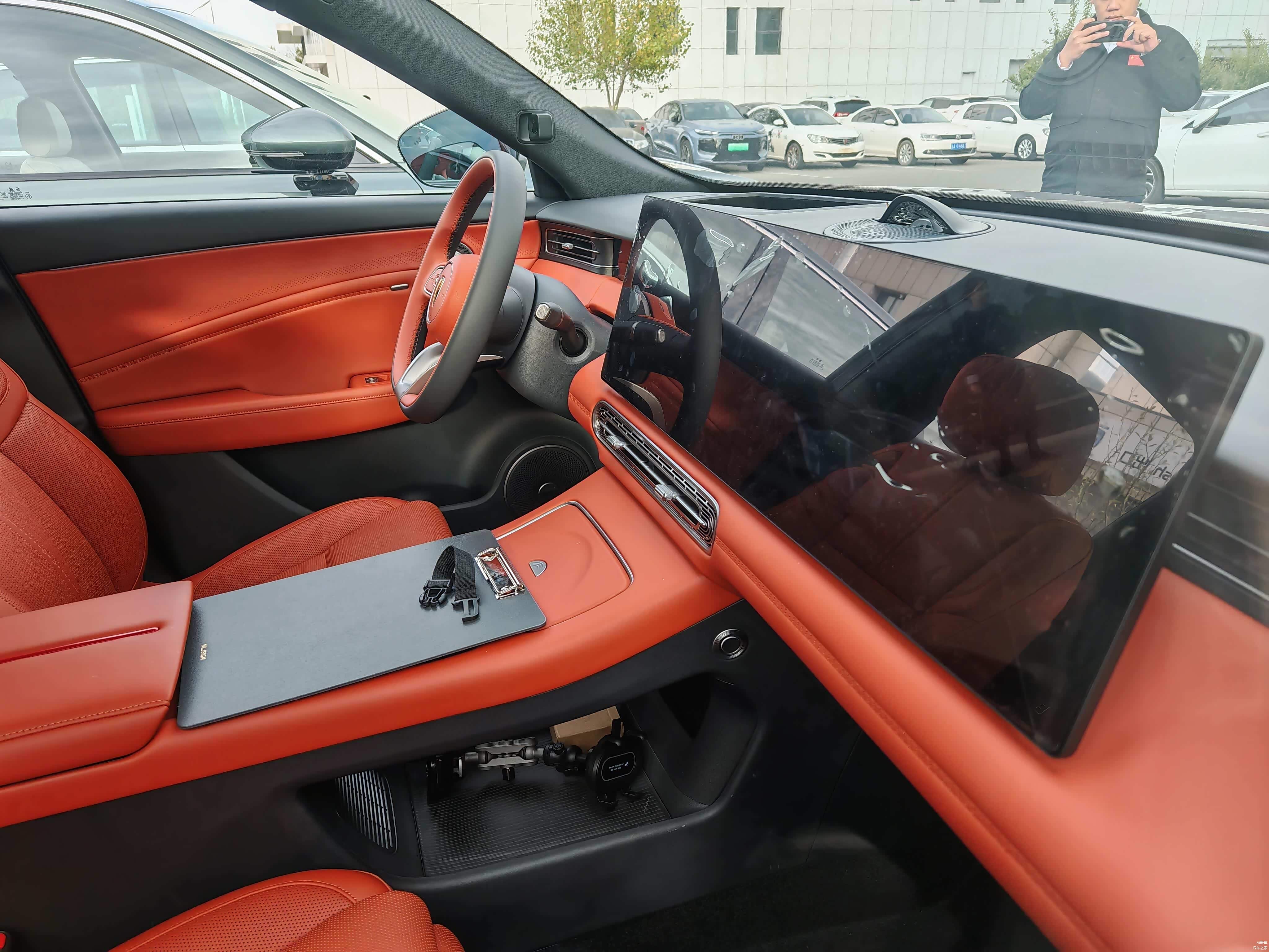 内饰提供米色、橙色、红色多种风格搭配。一体式双联屏是标配,全液晶仪表和HUD抬头显示都没缺,科技氛围很浓。三幅多功能方向盘配电子怀挡,副仪表台的50W手机无线快充和双杯架是实用配置,中置水晶扬声器会发光,配合12扬丹拿音响系统和主动降噪,听音乐体验应该不错。