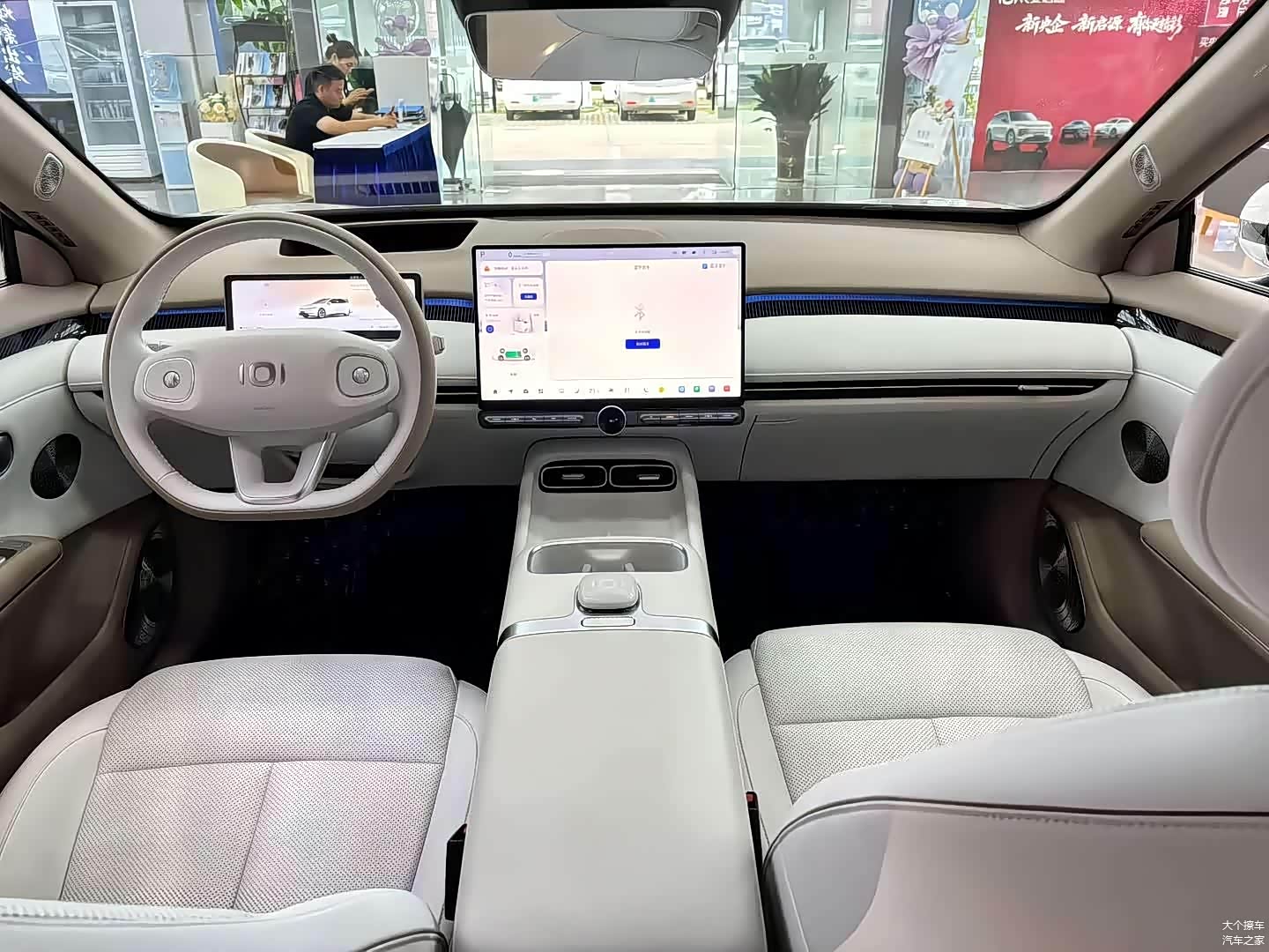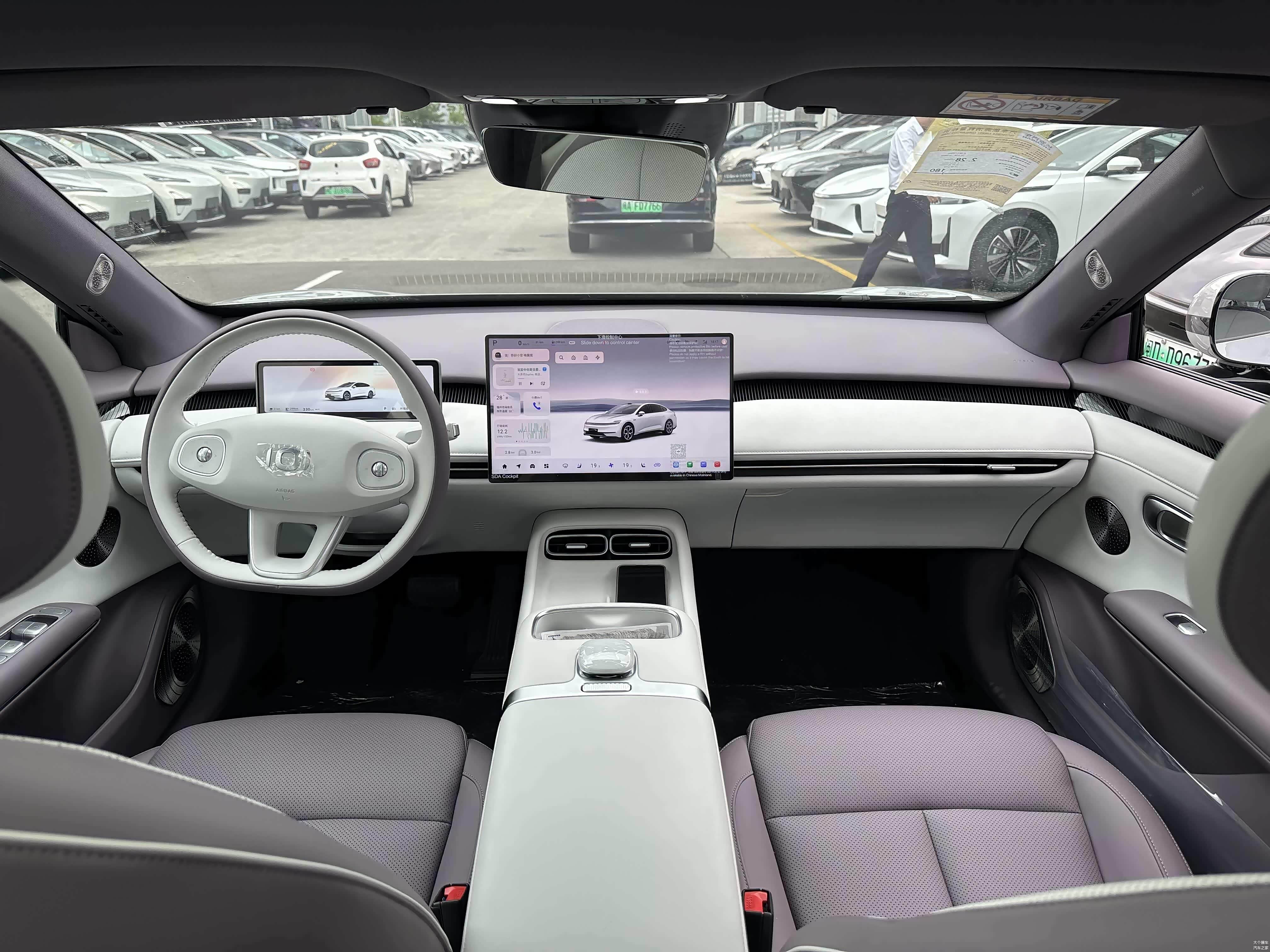 车辆的内部装饰提供了三种不同的双色选择,包括白紫、白棕和咖灰。大规模的皮质覆盖和环绕的氛围灯营造出一种豪华的氛围。中控台的对称设计与悬浮屏和矩形液晶仪表相结合,增强了AR-HUD的科技氛围。在设计拓展磁吸实体按键时,参考了小米SU7的设计,因此可以独立购买扩展功能。配备了三个方向盘和电子怀挡的副仪表台,以及双50W的无线快充和多功能F-Card交互按钮,都非常实用。