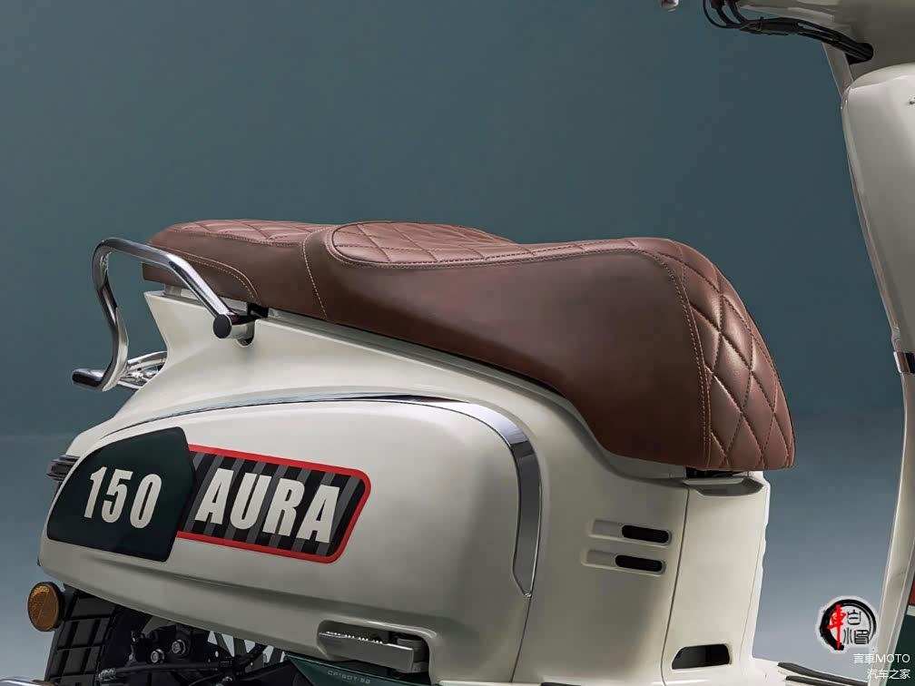 150 AURA采用"新经典主义"设计语言,前脸通过大面积留白处理与贯穿式光环灯带营造出独特辨识度。车身轮廓以紧凑尺寸为基础,圆润线条从车头流畅延伸至短尾,镀铬装饰件点缀得当。流光白等四种配色采用汽车级双固化烤漆,实车质感不低于跨骑车型水准。值得留意的是,手把下方折叠挂钩与承重的后扶手等细节,透露出对实用性的细致考量。