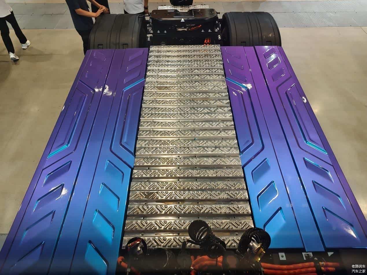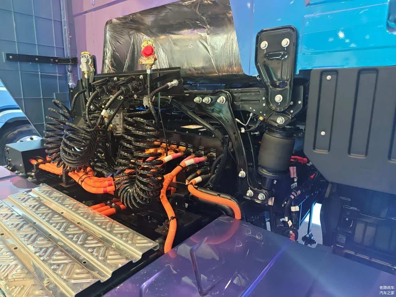 拍摄车与国内常见的纯电动牵引车的一大区别就是驾驶室后部没有设置动力电池舱,车上搭载的600kWh动力电池,全部布置在车架左右两侧。底置电池既可以充电也可以换电,使用起来非常方便。电池容量大、底盘重心低、空气阻力小是它的主要优点,这使得它更适合于快递物流运输使用。