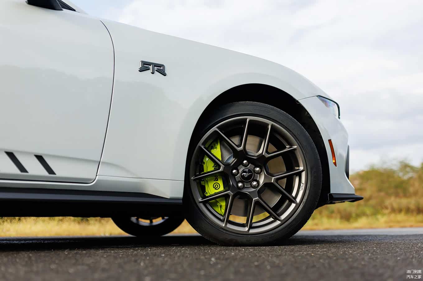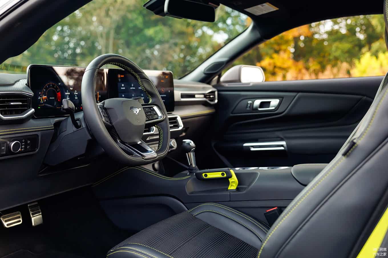 Mustang RTR内饰使用磨砂质感深色阳极氧化表面材质点缀亮柠色,新增雪影灰配色。Mustang硬顶掀背车型搭载RTR套件车型可选装亮柠色外观套件,以亮柠色替代原有的黑色Brembo刹车卡钳,同时原来的深色阳极氧化表面也会融入亮柠色,形成亮柠色渐变图案。