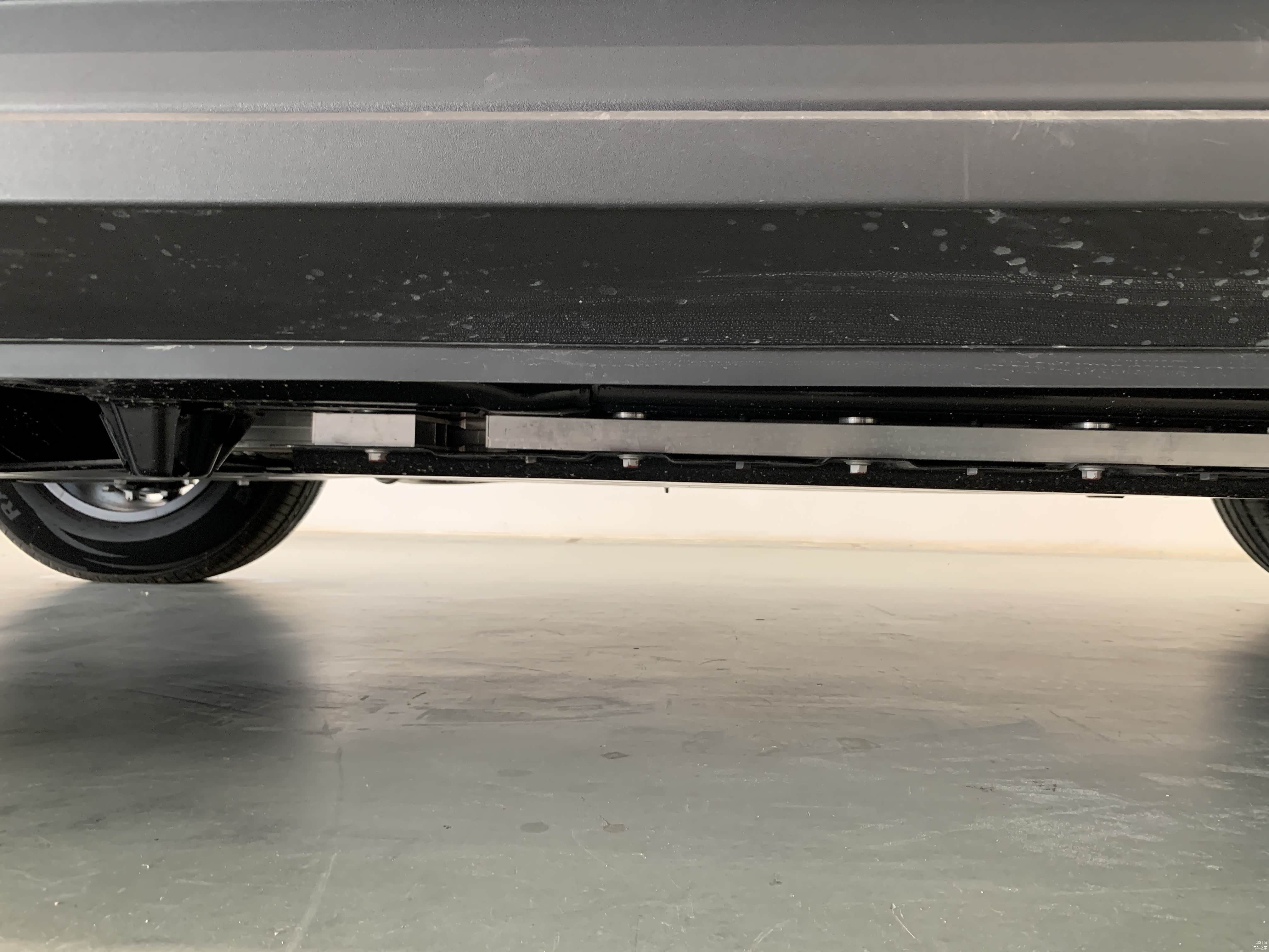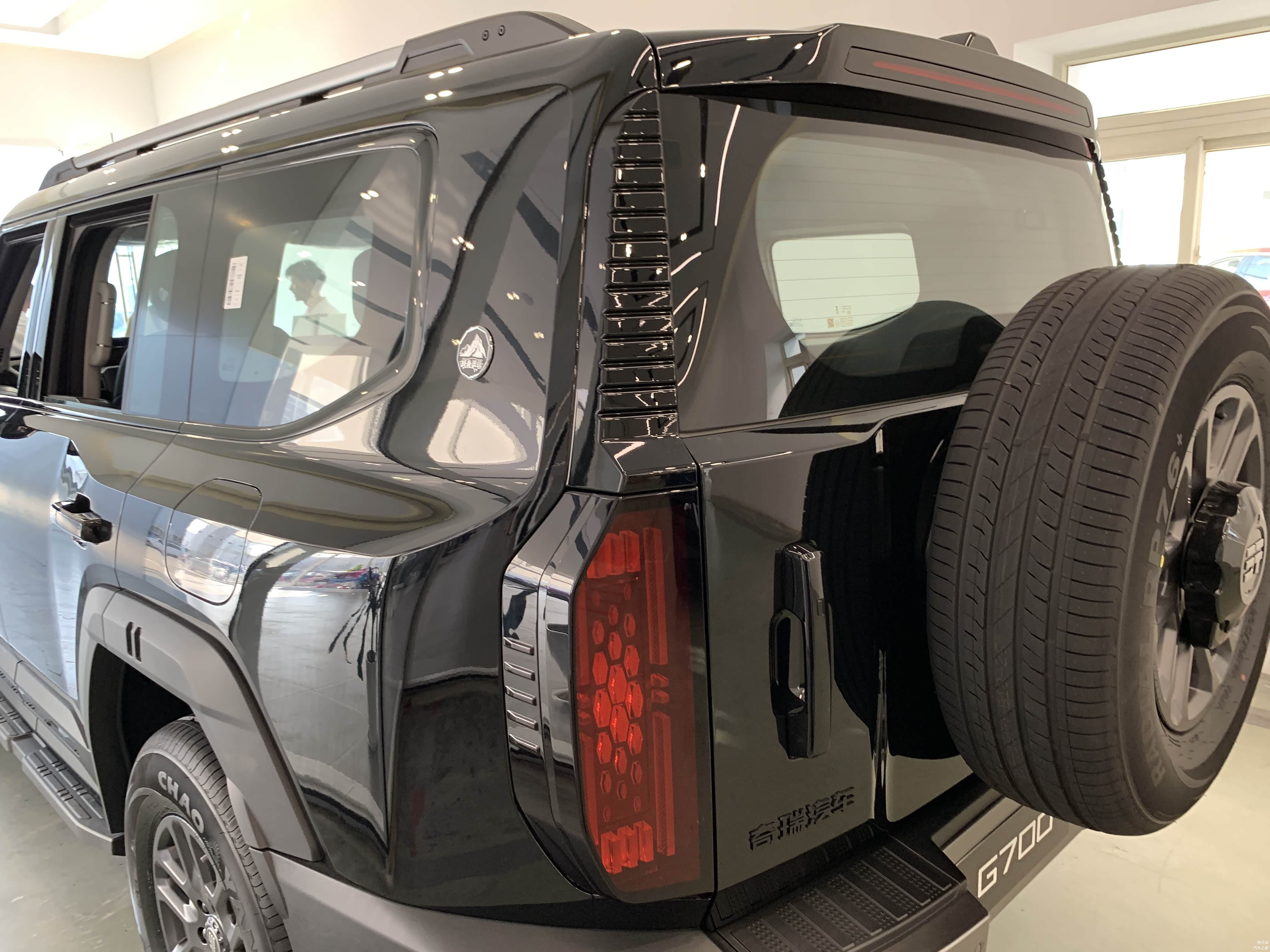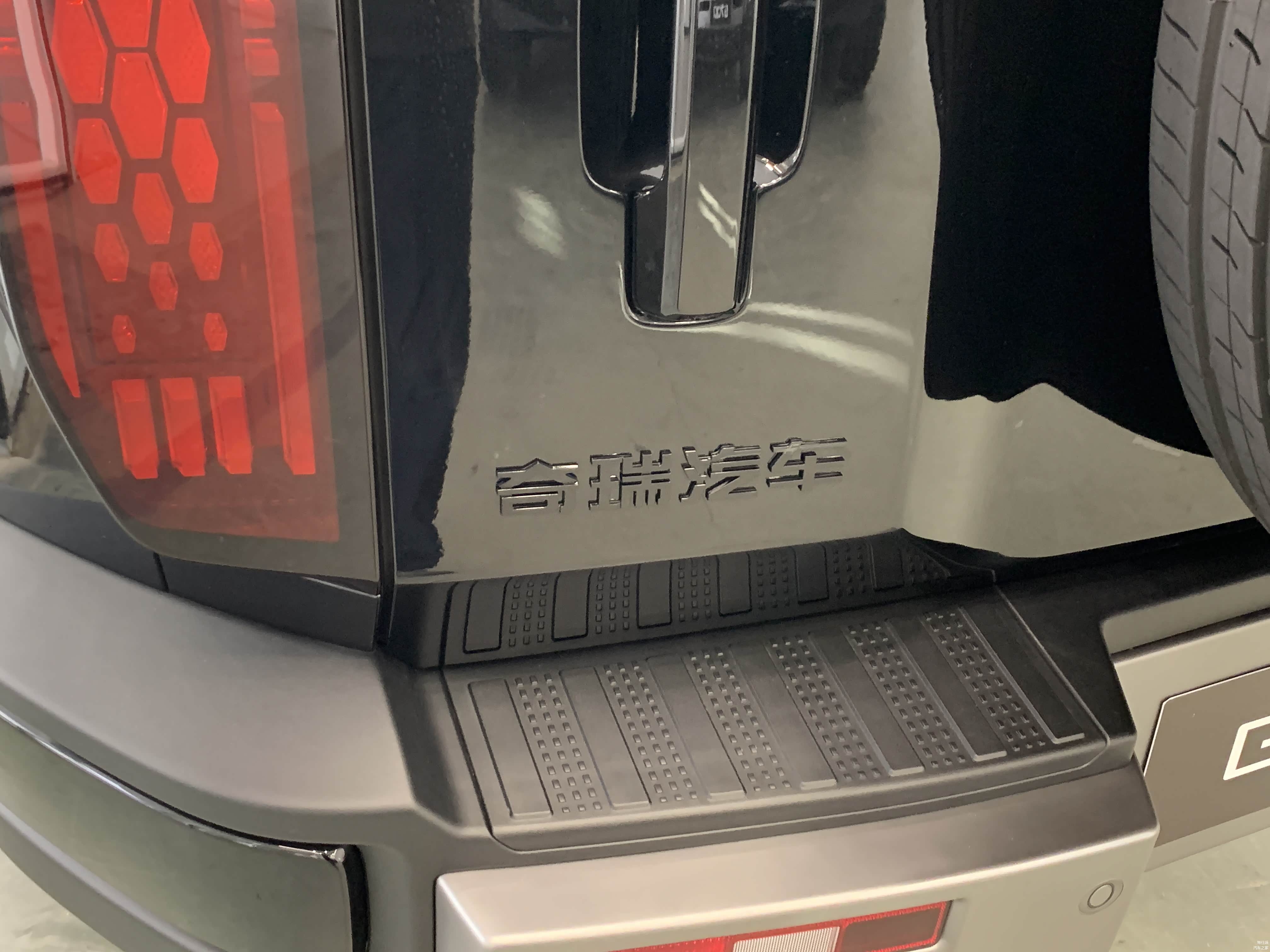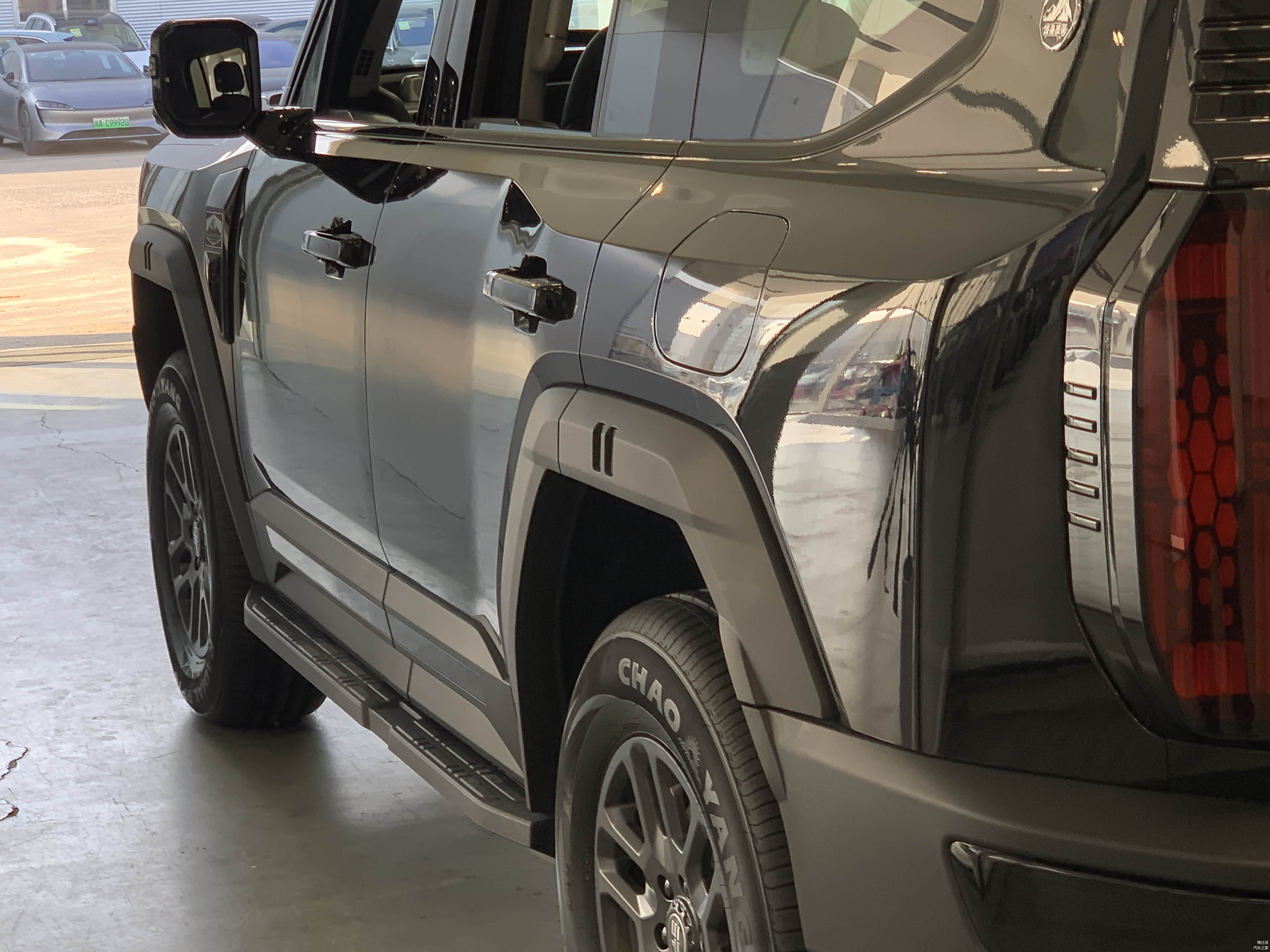低配车型18寸轮毂搭配的是朝阳轮胎,固定式脚踏板。高配20寸轮毂则是佳通轮胎,电动可伸缩脚踏板,且高配车型车尾备胎还有亮面漆的外罩。