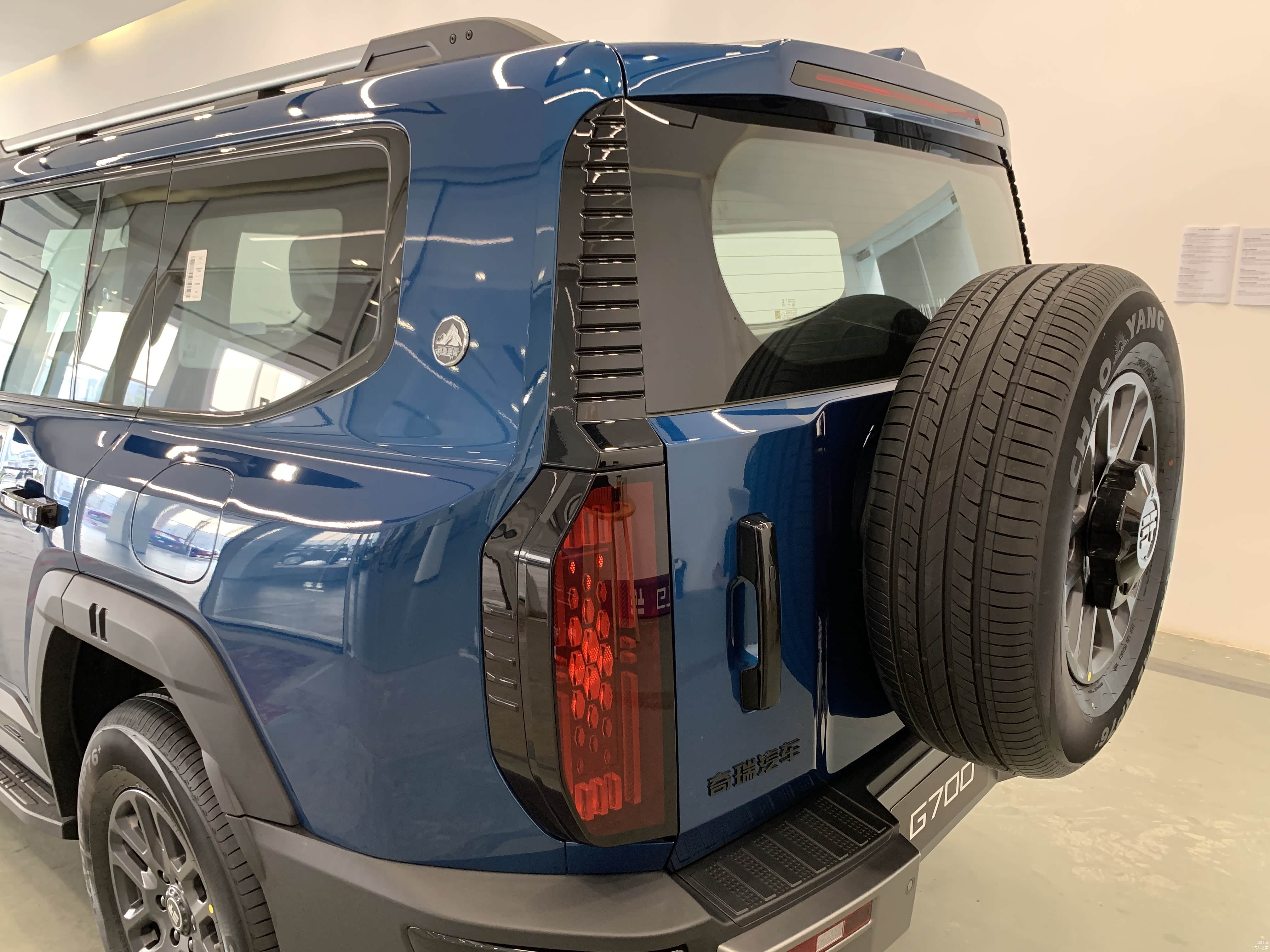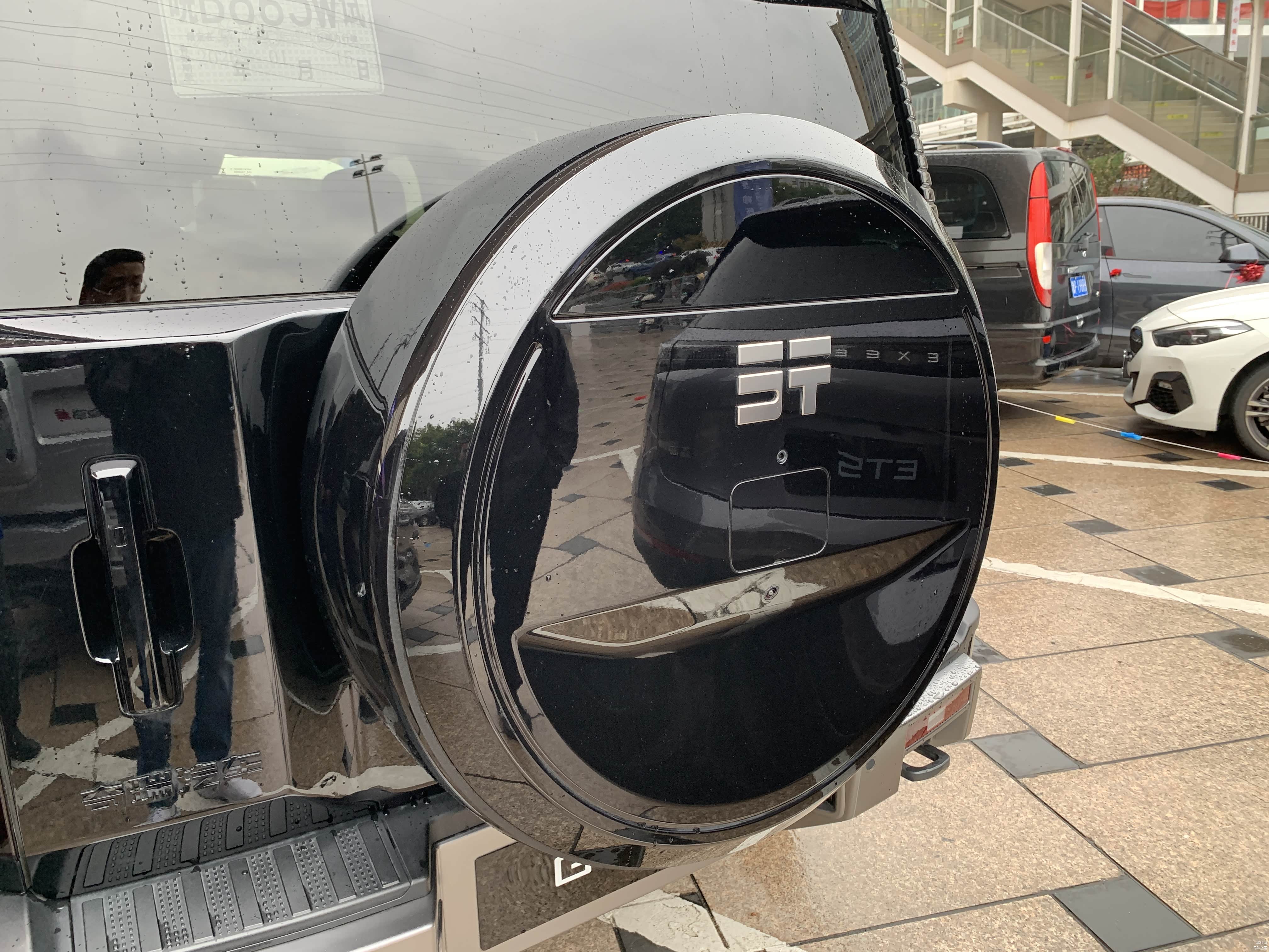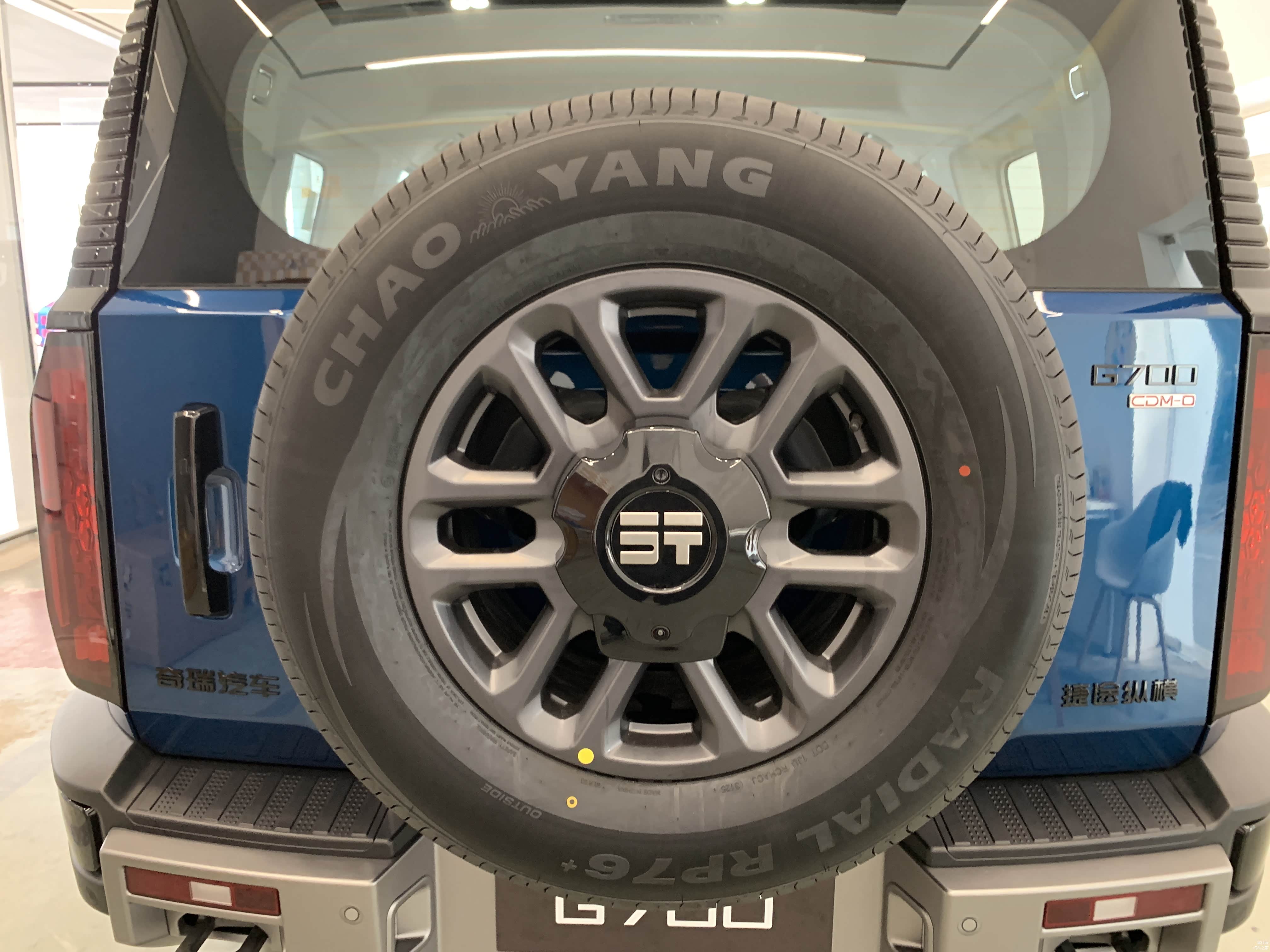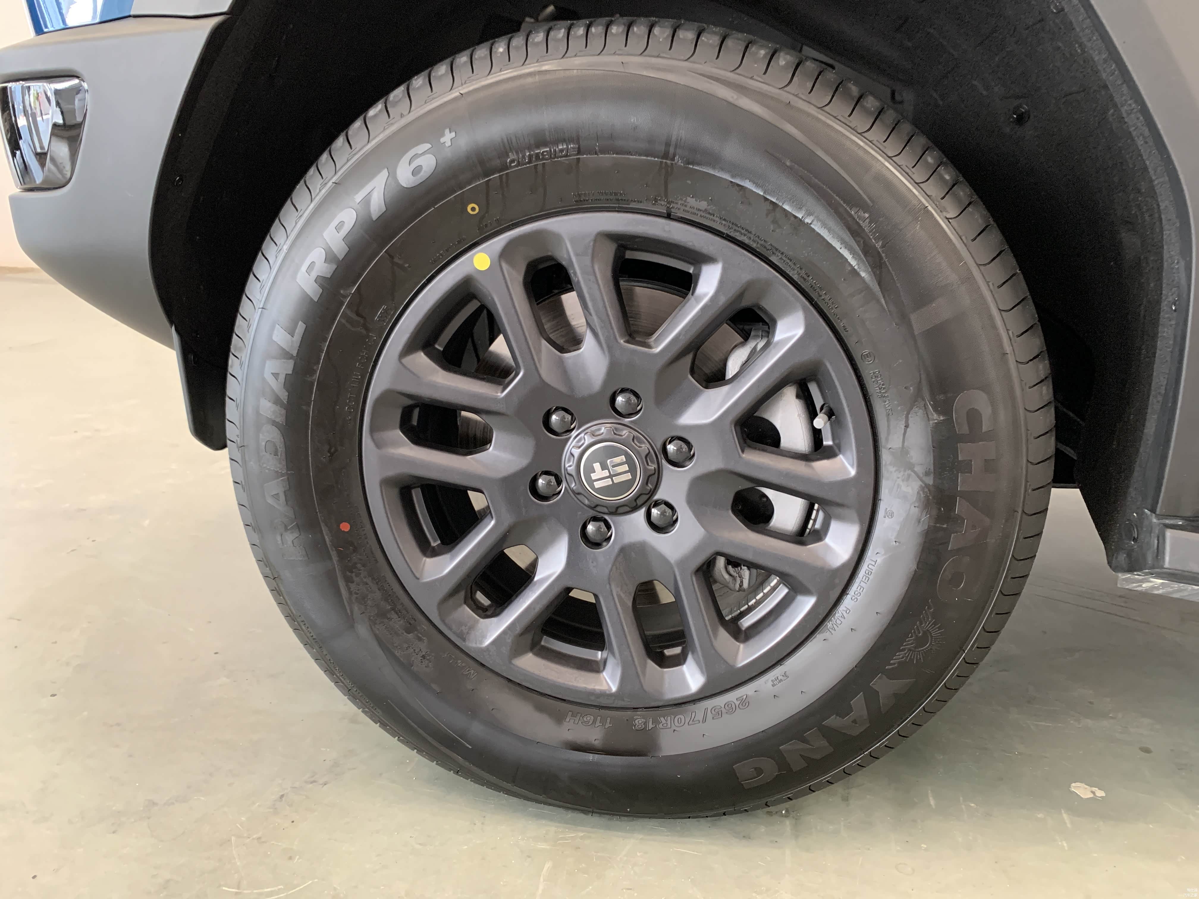 低配车型18寸轮毂搭配的是朝阳轮胎,固定式脚踏板。高配20寸轮毂则是佳通轮胎,电动可伸缩脚踏板,且高配车型车尾备胎还有亮面漆的外罩。