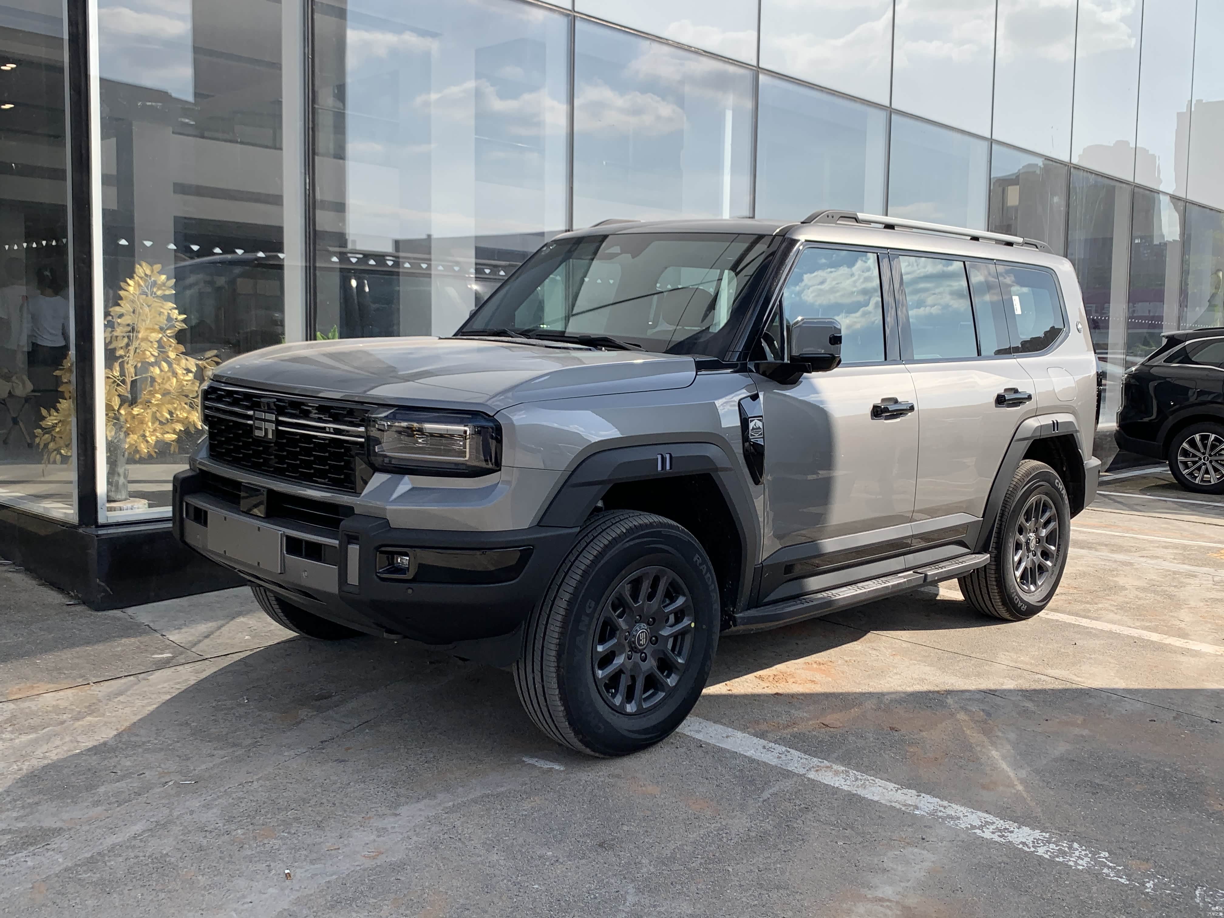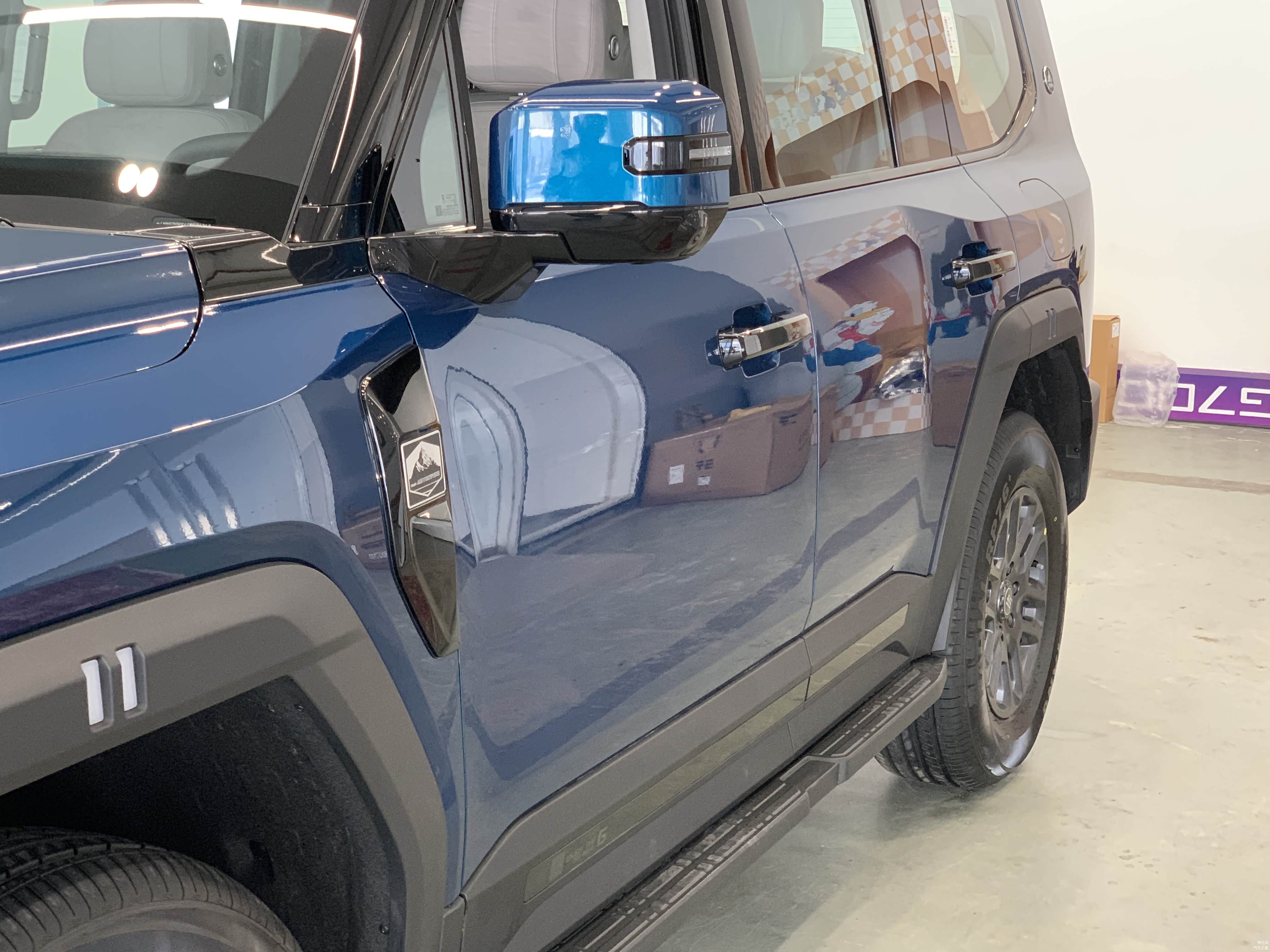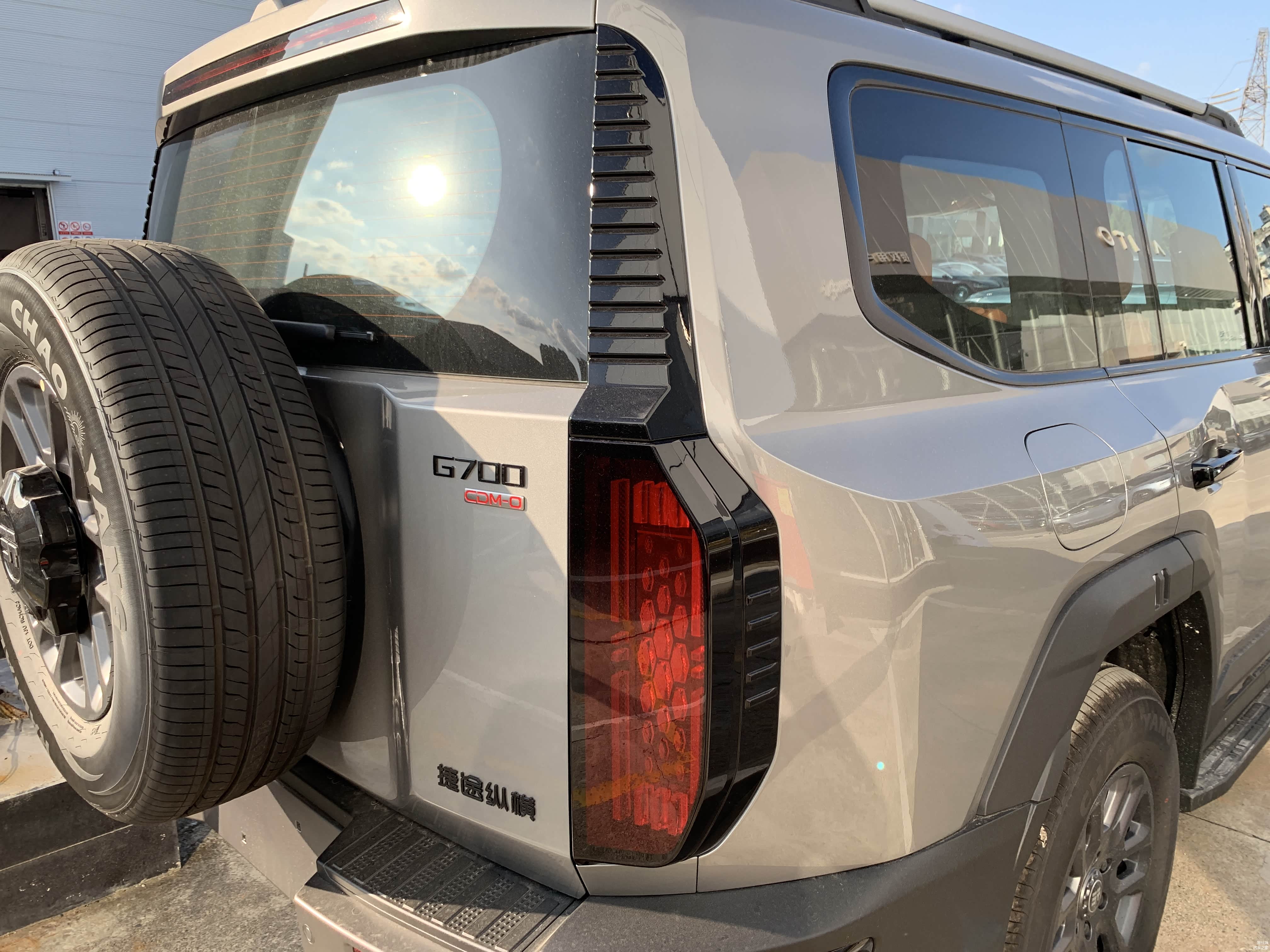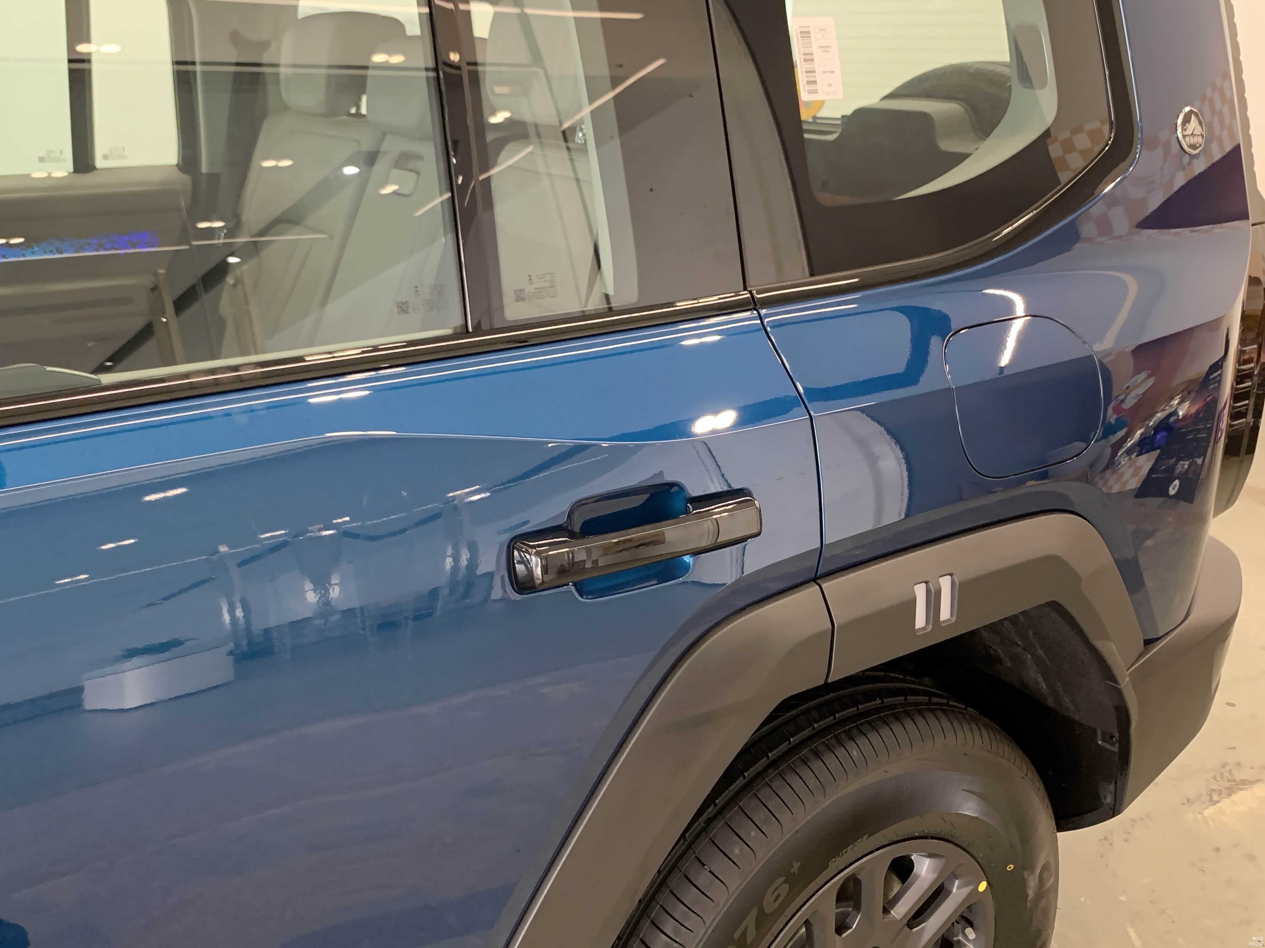 低配车型18寸轮毂搭配的是朝阳轮胎,固定式脚踏板。高配20寸轮毂则是佳通轮胎,电动可伸缩脚踏板,且高配车型车尾备胎还有亮面漆的外罩。