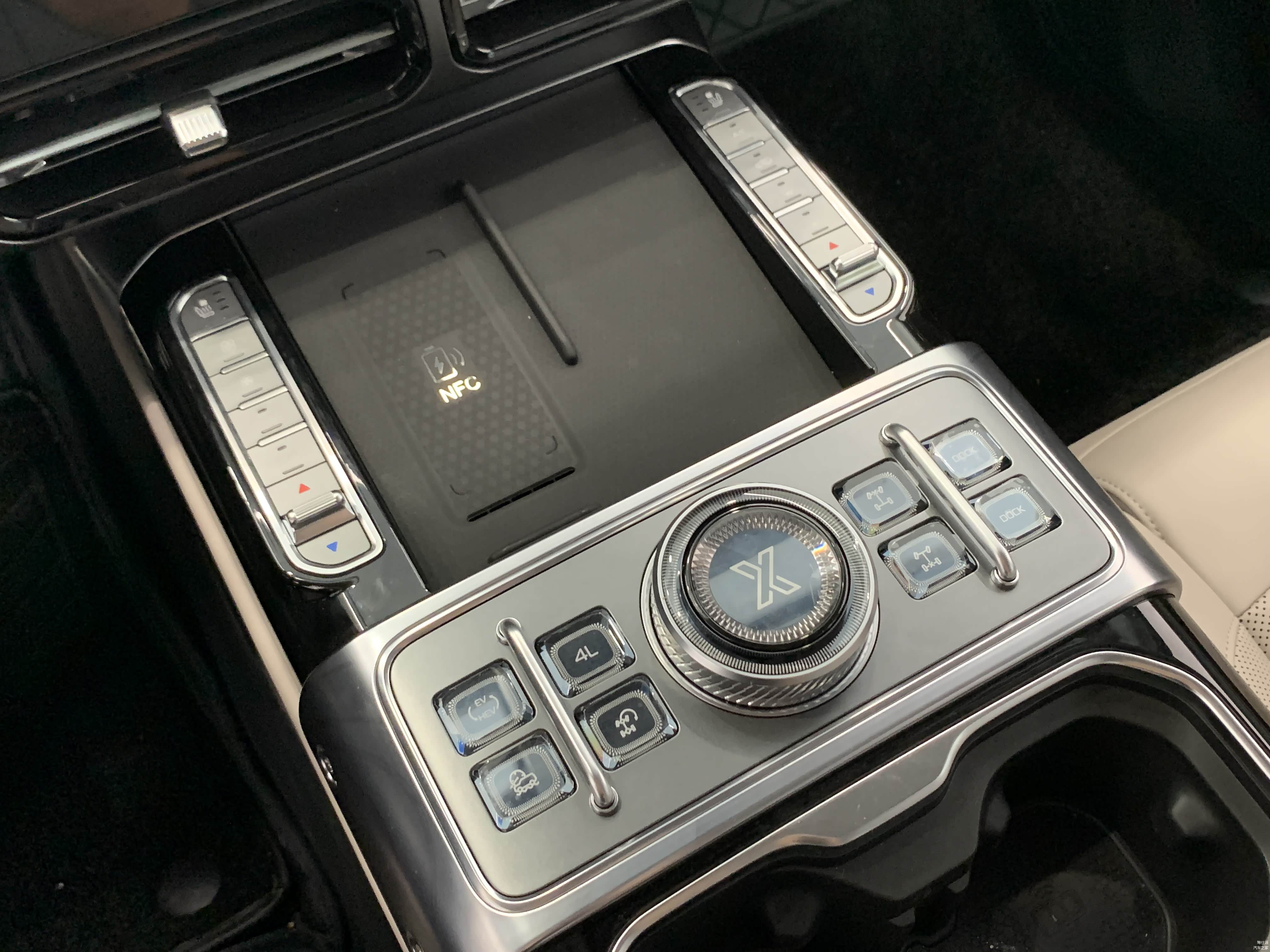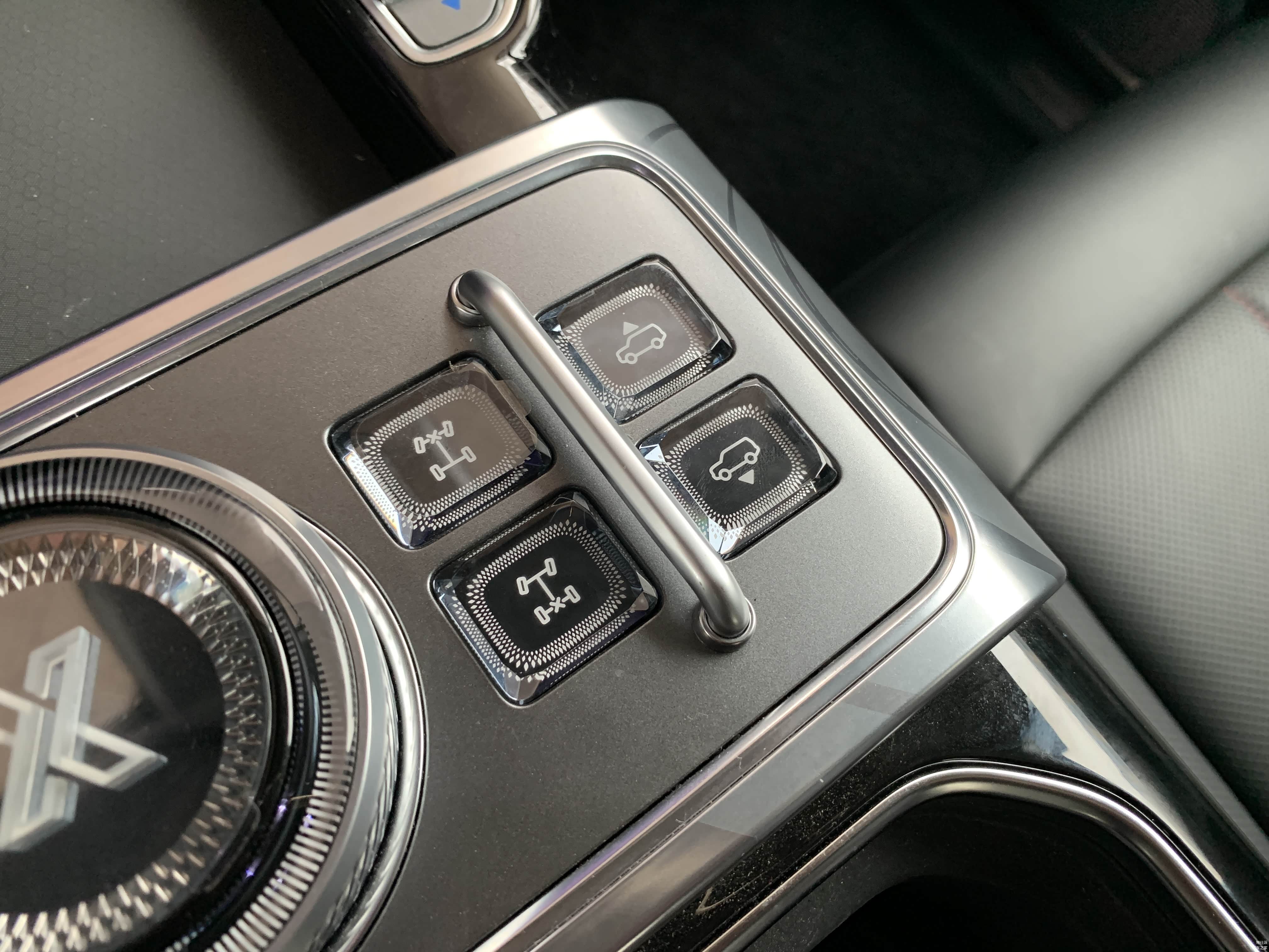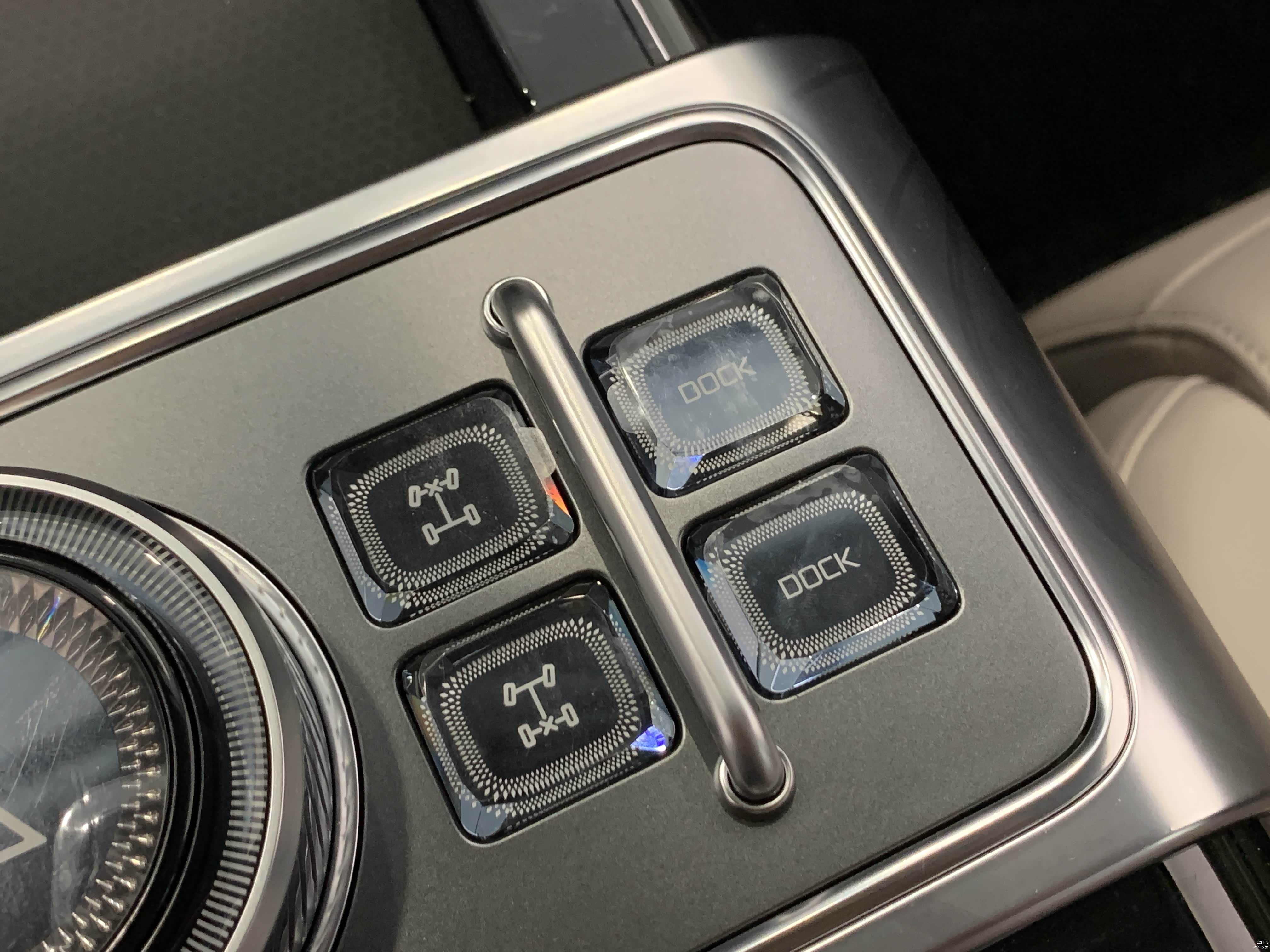 中央扶手上的透明按键和旋钮,质感和手感都挺不错。没有空悬的版本,最右侧两个按键是固定装饰用,也比空着好了很多。