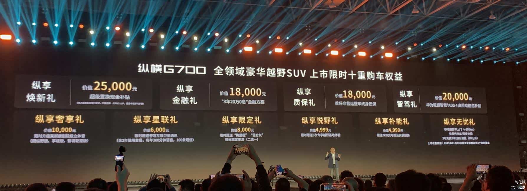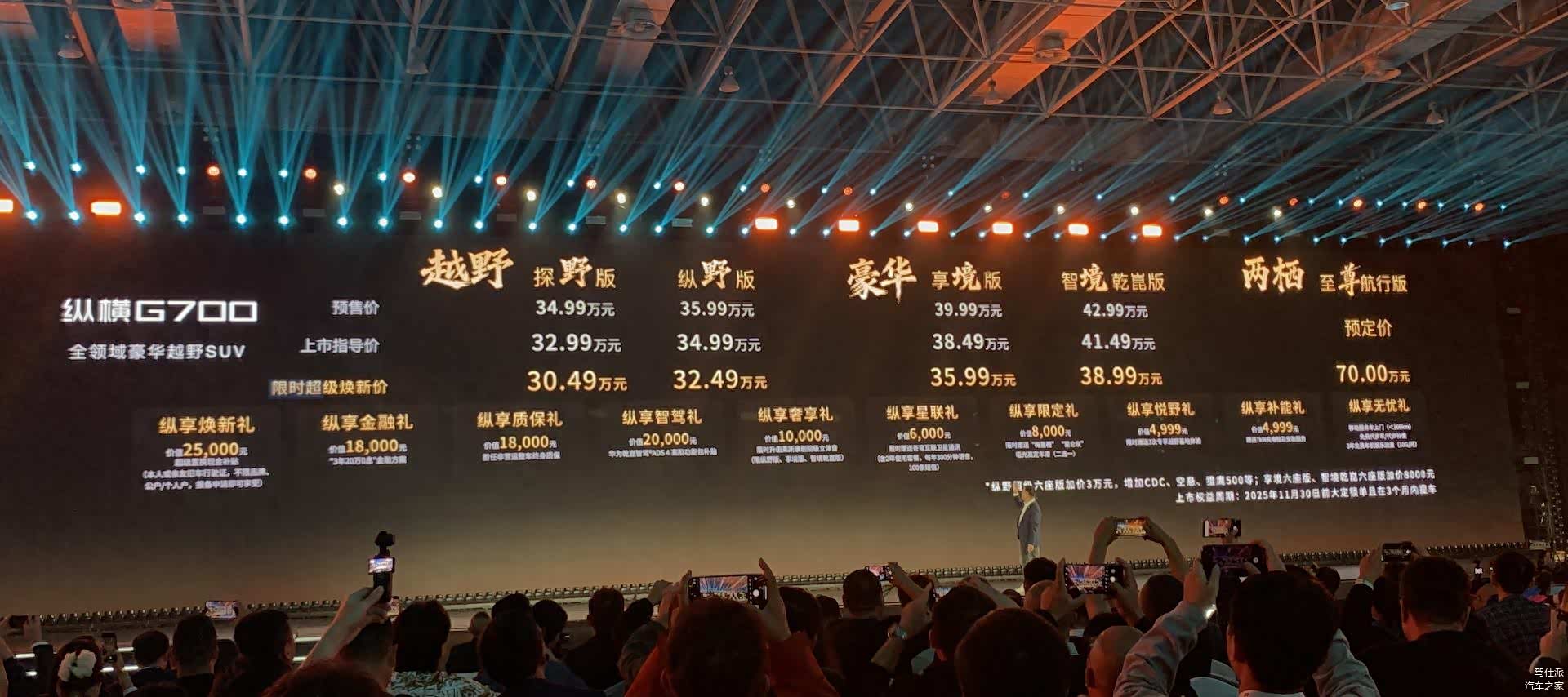 10月19日, 捷途纵横G700(图片 | 参数 | 询价)正式上市,按官网配置,全系共7款车型,上市指导价32.99-41.49万元,提供7种车身颜色,3种内饰颜色搭配。上市现场,还公布了限时超级焕新价30.49-38.99万元。另外还有一款两栖至尊行航行版,预定价70万元。