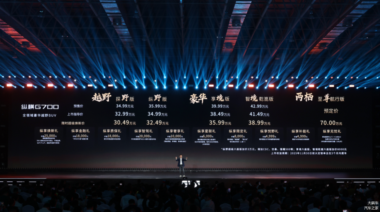 2025年10月19日,纵横品牌旗下首款量产车型G700在安徽芜湖宜居国际博览中心正式上市。新车定位为“全领域豪华越野SUV”,共推出四款配置,官方指导价区间为32.99万元至41.49万元,限时起售价为30.49万元。发布会上同步公布了涵盖置换补贴、金融方案、智驾功能包等在内的十项购车权益。