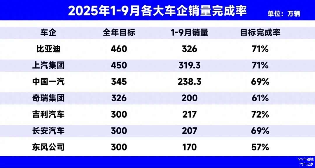 在众多车企中,比亚迪、吉利、上汽这三家“种子”选手表现出色,其目标达成率均超过了70%。其中吉利汽车完成率高达72%,吉利9月销量达到27.31万辆,创下历史新高,也推动1-9月累计销量达到217万辆,已超过2024年全年。按照吉利汽车目前的发展势头,今年完成300万辆的销量大计指日可待。