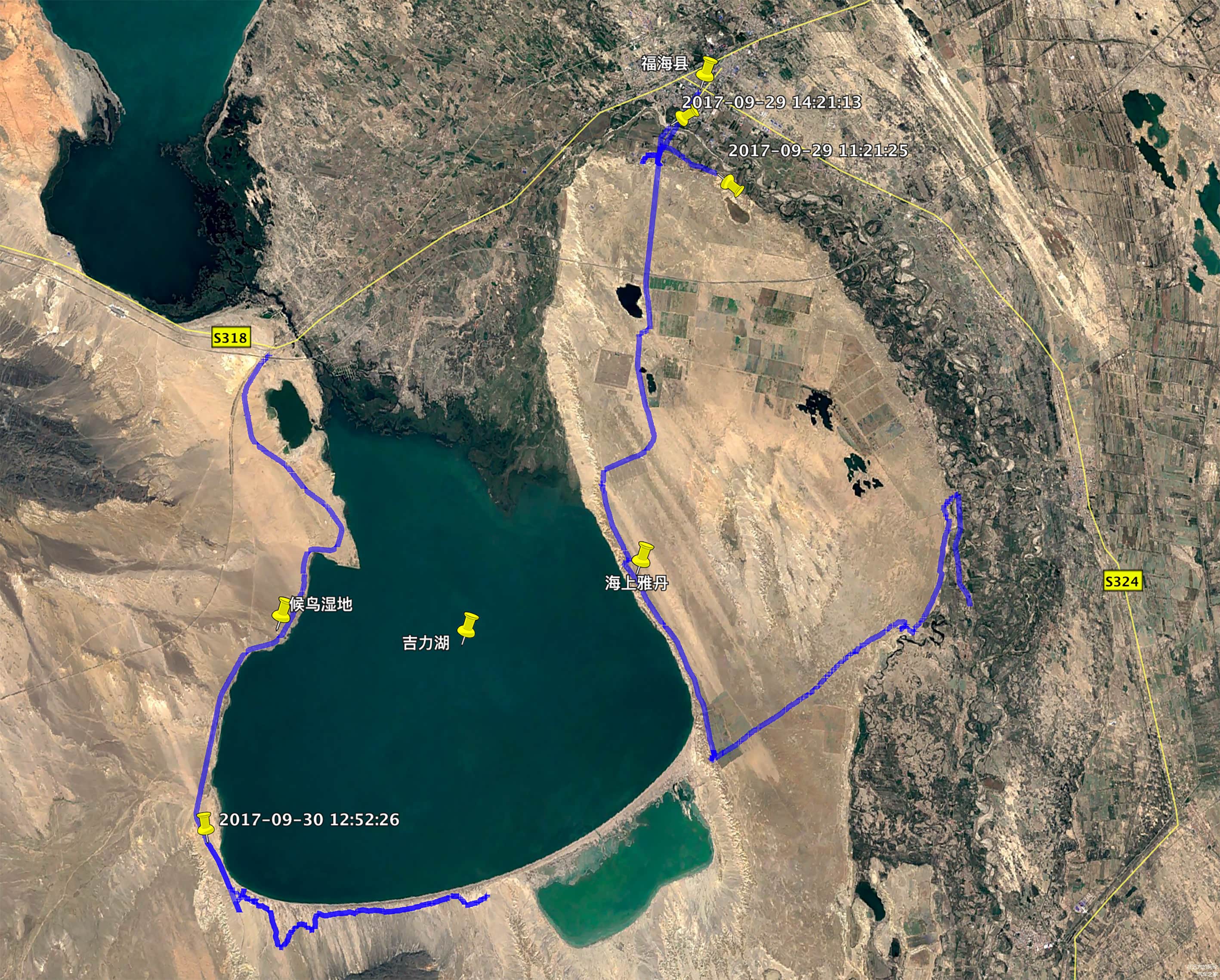 最右侧的路迹是我当天的GPS卫星轨迹图,我是从S324省道往西,爬到戈壁上,然后才到达的吉利湖东岸,第二天再沿湖边的一条土路往北回到的福海县,很不推荐(其实应该从离开的那条路进),而在这片荒无人烟的戈壁滩上还有一些不可描述的设施,我就不放图了。
