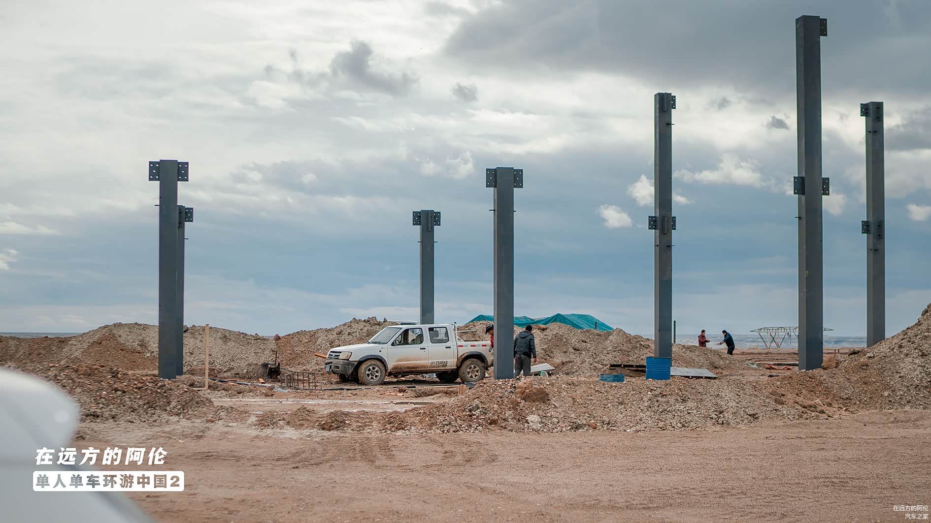 直到在这片戈壁里开了一个多小时后,我才发现些耸立的人工建筑物,走进一瞧,是个施工现场。我跟工地上的一个工人询问情况,他告诉我这里就是吉利湖东岸,他们在这儿修旅游设施,我心里一紧,看来这里已经是在开发初期了。