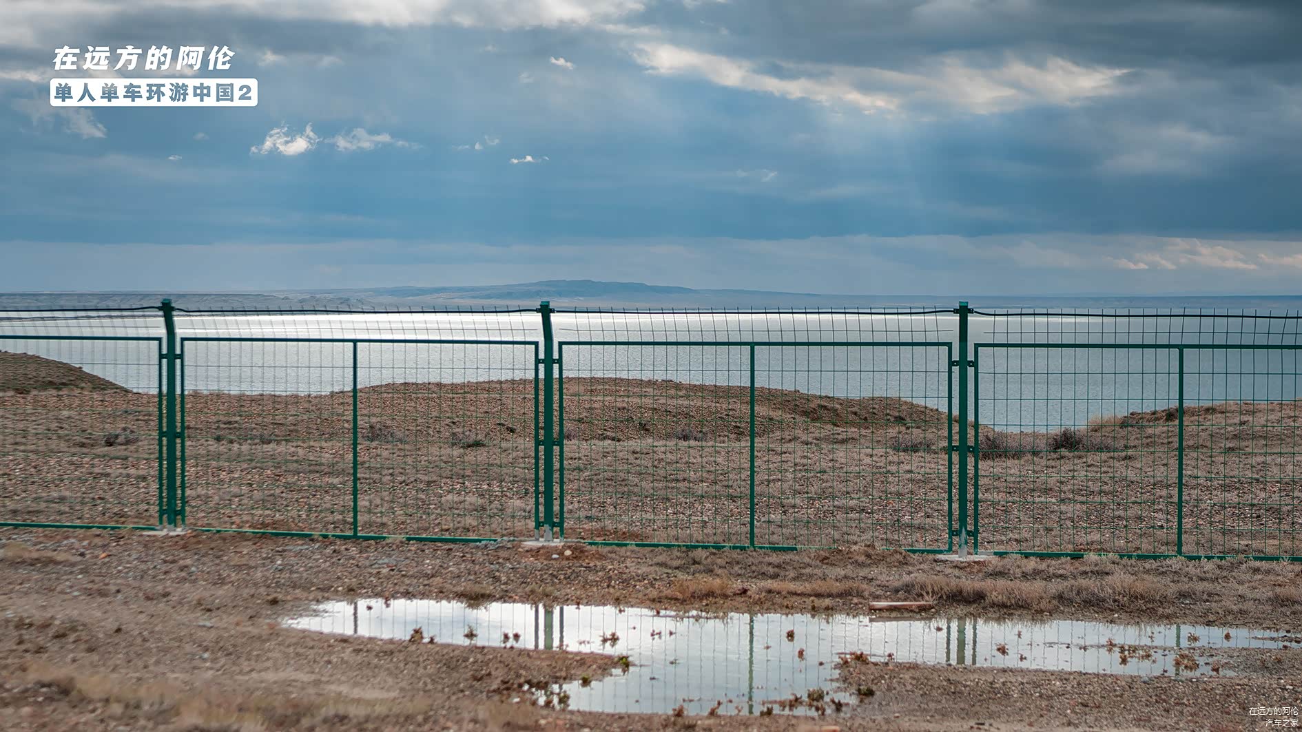 我在随后看到一条景区正在修建的公路(也是才推出来的),沿着它慢慢往北驶去,这才看到了一侧的吉利湖,不过可惜的是,一道长长的铁栅栏把那片神秘的幽蓝和我给隔开了。