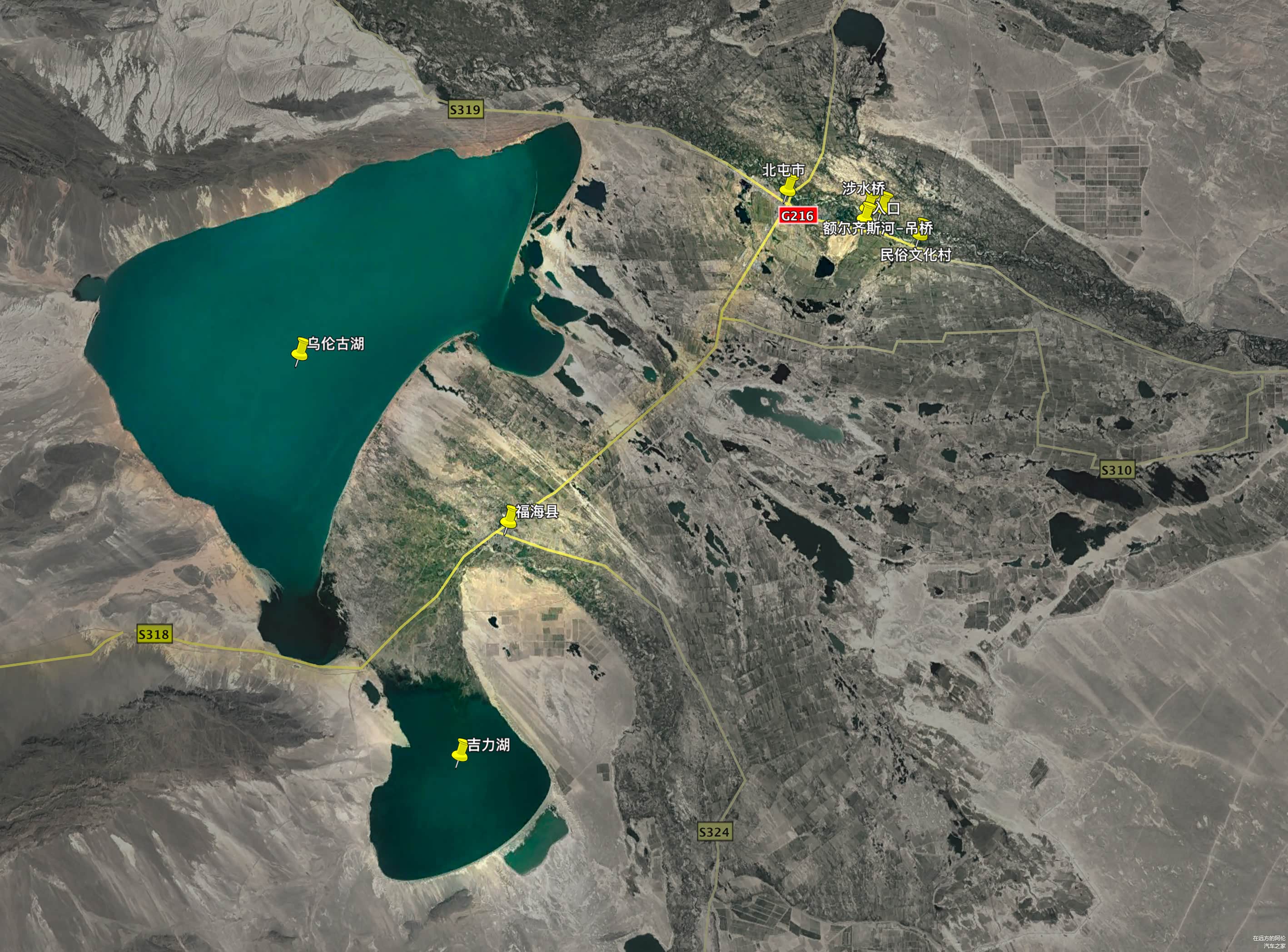 以福海县为中心,这一南一北有两个湖,北边的大湖叫做乌伦古湖(习惯叫法),南边的小湖叫做吉利湖,这两个湖是克拉玛依市通往阿勒泰的必经之地。