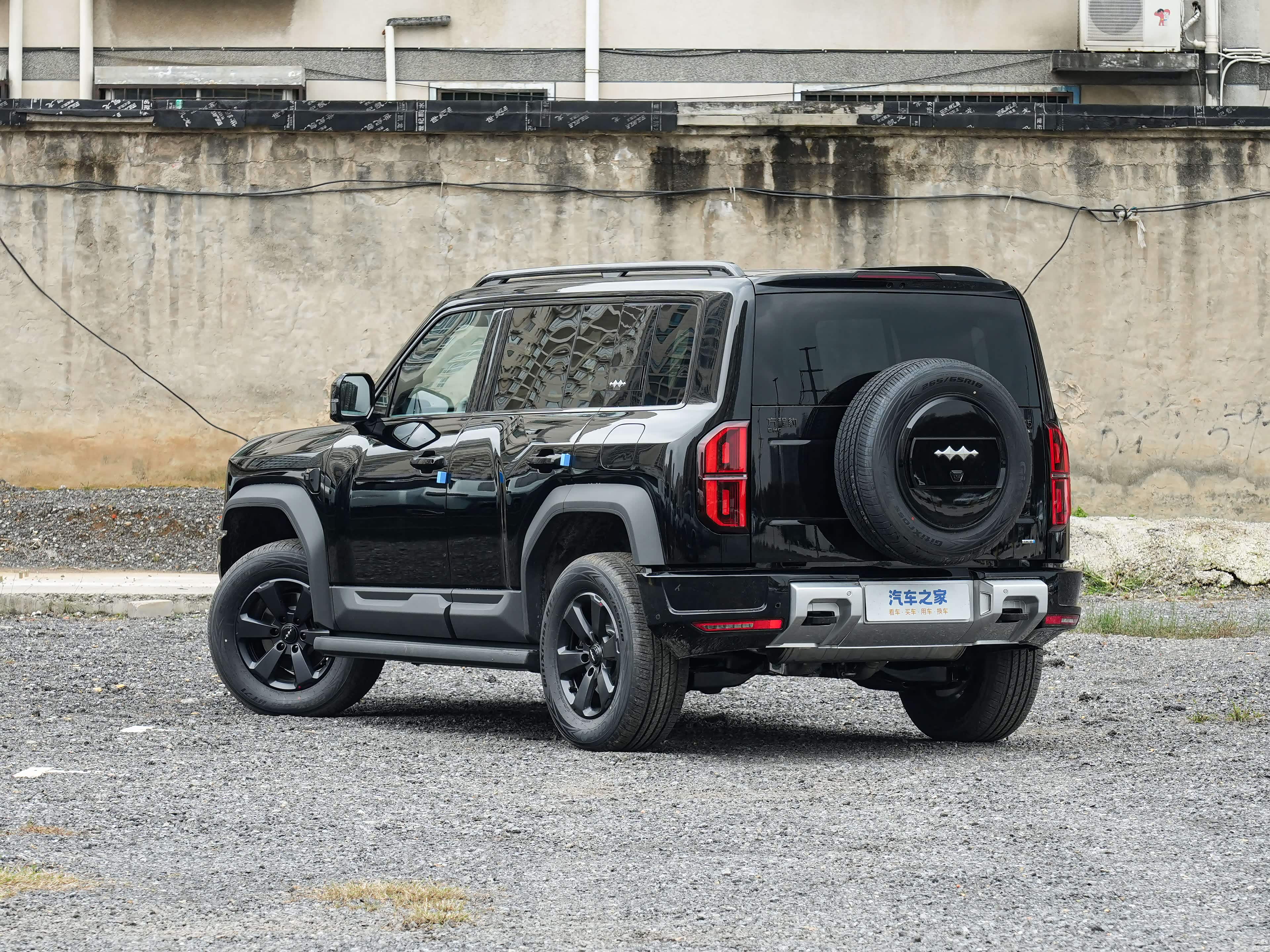 尾部设计同样走硬朗路线。车顶高位刹车灯,熏黑尾灯组竖向排列,内部结构做出了立体层次。外挂全尺寸备胎该有的都有,尾门侧开设计方便取放物品。下包围厚实,两侧带雾灯,中间银灰护板延续前脸风格,力量感拉满。