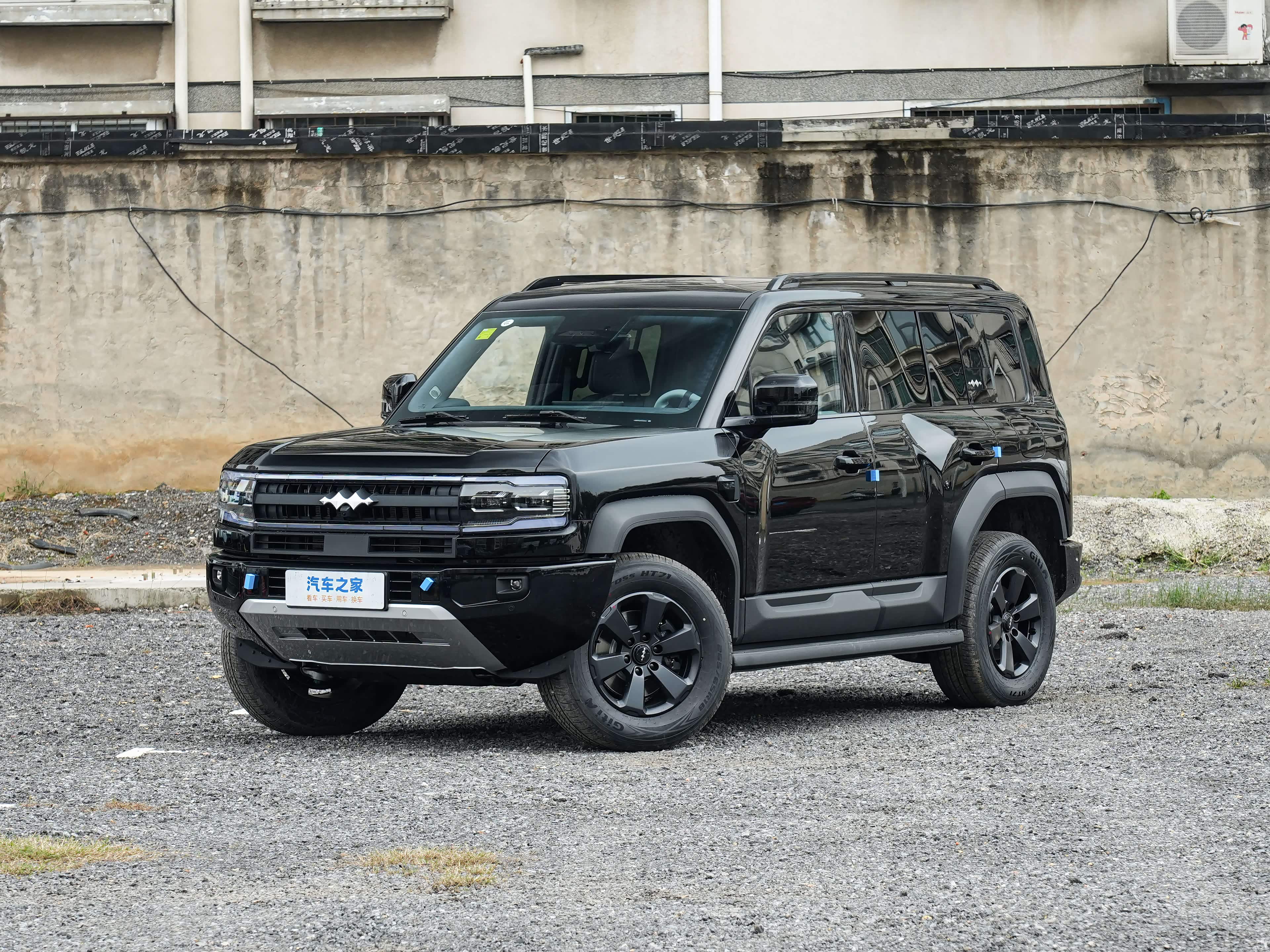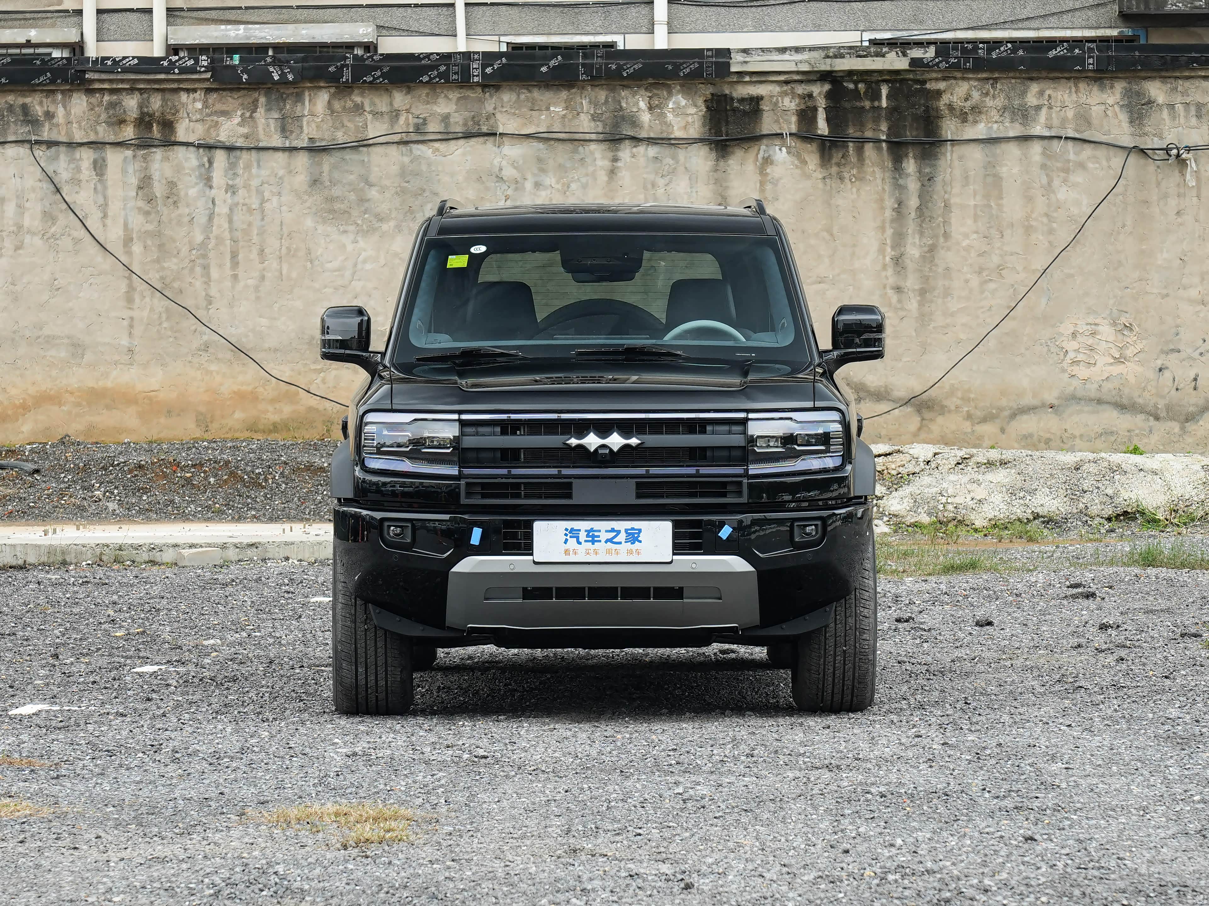 外观延续了硬派设计路线。前脸用粗犷的格栅搭配熏黑大灯组,机盖上隆起的筋线营造出肌肉感。前包围装了厚实的保险杠,两侧集成雾灯,中间保留了小尺寸进气口,底部银灰色护板增加了些野性。这套设计语言在硬派SUV里算常规操作,辨识度有但不算特别突出。