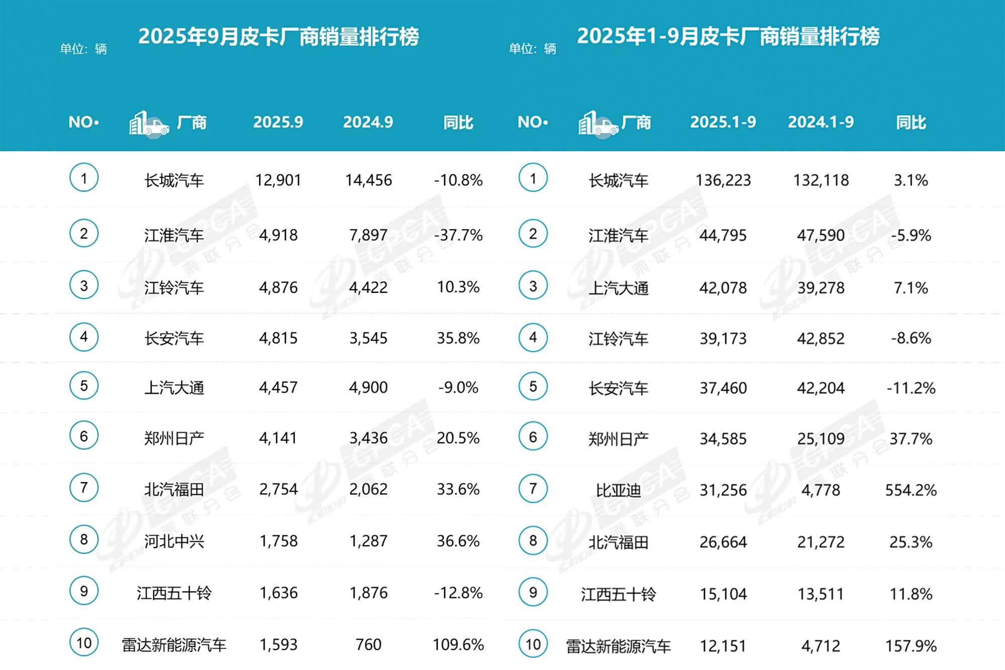 新能源赛道正成为破局者的试验田。雷达皮卡9月以1593辆销量、同比暴增109.6%的战绩,与长安增程皮卡、郑州日产新能源车型共同构筑起“三强”矩阵。更令人瞩目的是比亚迪,以693.5%的累计同比涨幅,成为“出海+新能源”双料黑马,与吉利雷达在海外新能源市场形成“中国双子星”。