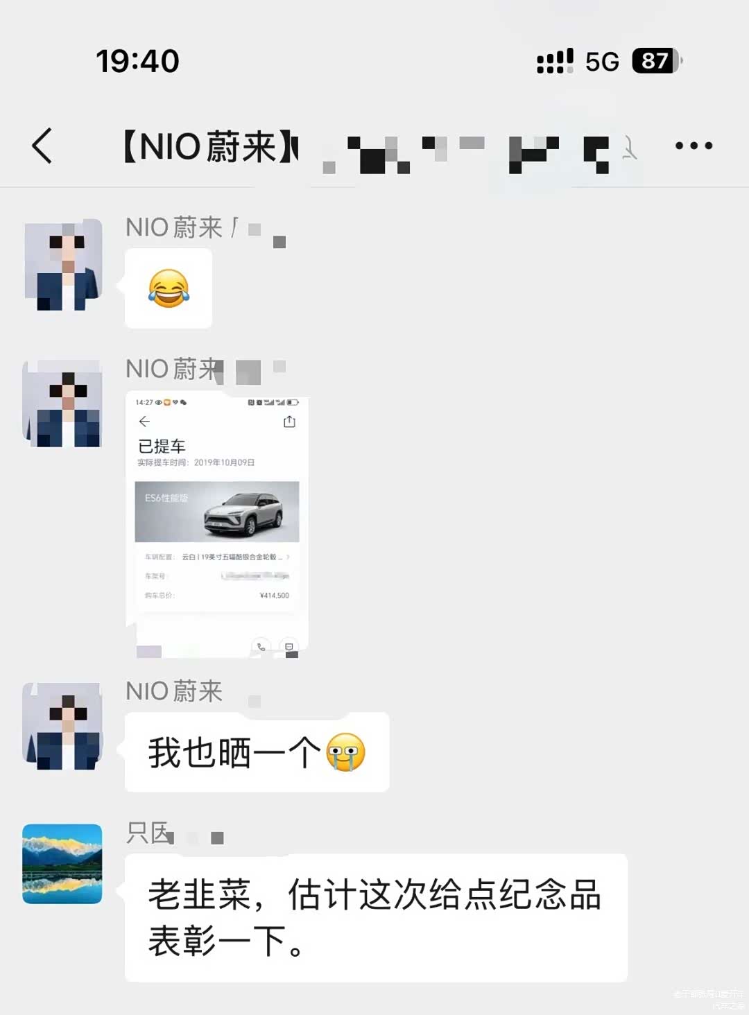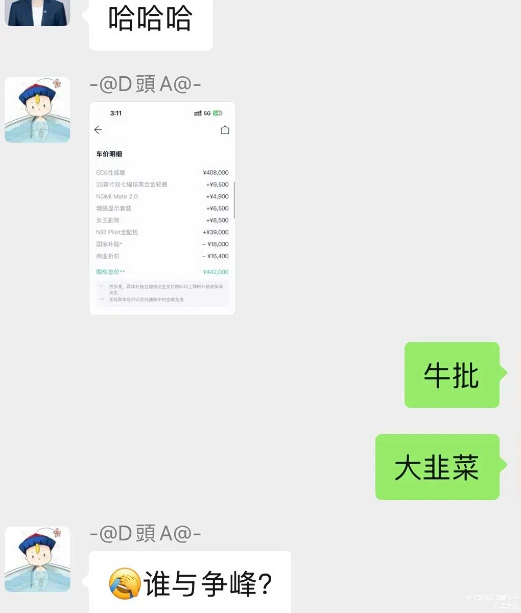自嘲玩嗨的战火还从车主APP社区燃到了微信车主群里,每每逼近45万的订单一出,群友齐点赞膜拜。甚至有蔚来Fellow也参与进来,晒出自己的41万+订单,惹得群友高呼“销冠狠起来连自己都割啊”“要想成功、必先自……”