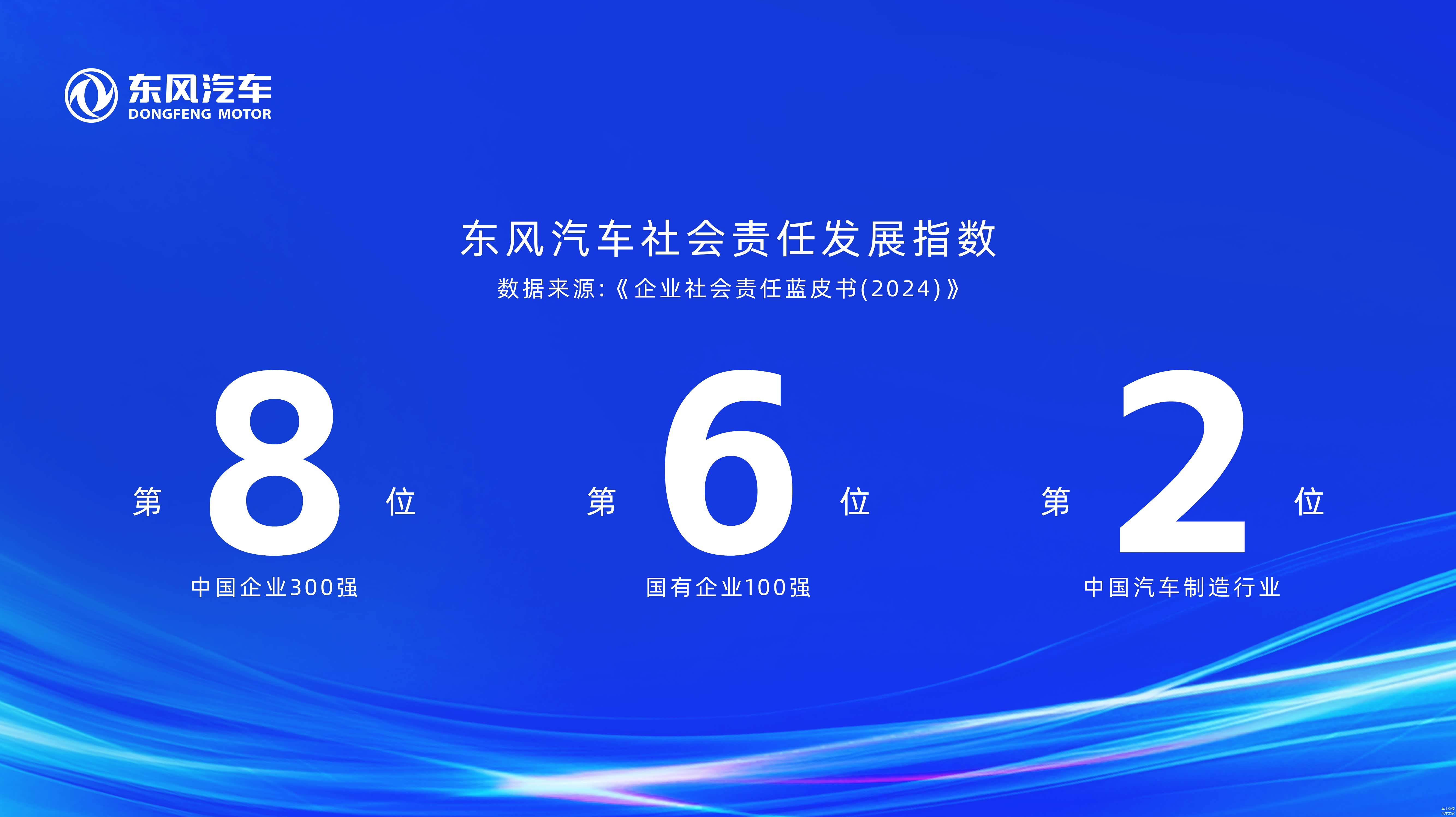 东风汽车通过常态化开展的 “可持续发展共创周”等履责活动,形成了从顶层设计到基层实践的完整闭环,以扎实的履责实践稳步推进社会责任工作。2024年,东风汽车社会责任发展指数位列中国企业300强第8名,国有企业100强第6名;东风汽车入围“中央企业责任管理·先锋30指数(2024)榜单”,排名第6名,并首次入选“《中央企业社会责任蓝皮书(2024)》十佳案例”。