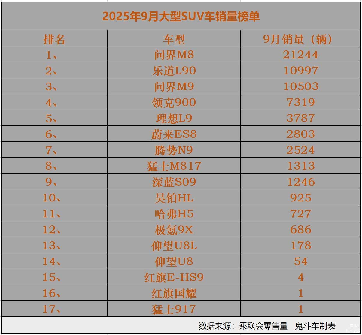 现在,随着越来越多国产大型SUV车型登场,这一细分市场格局发生了改变。这一点,在销量上体现得更明显,为了让网友们看得更清楚,鬼哥根据乘联会零售销量数据,整理出9月大型SUV销量榜单,接下来,看看哪些车型榜上有名?谁的销量表现更出众?
