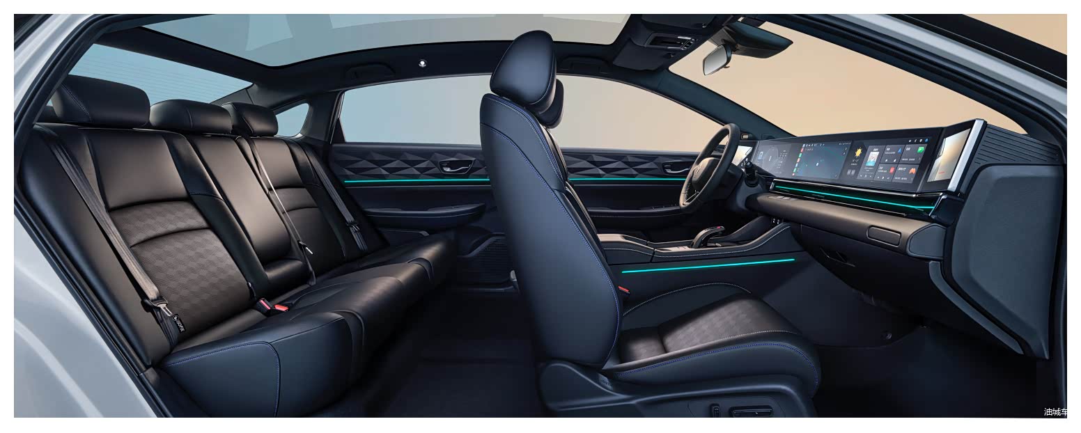进入车内,最引人注目的是贯穿式五联屏设计,包含12.3英寸全液晶仪表、中控屏、副驾娱乐屏以及两侧的电子后视镜显示屏。车辆还配备手机无线充电、多模式驾驶选择等功能。相比2024款,新车将18英寸轮毂、128色氛围灯等配置纳入标配范围,后排中央扶手增设带桌板的杯架,并加入HUD抬头显示系统。这些配置升级使得起售价格较旧款上调2万元。