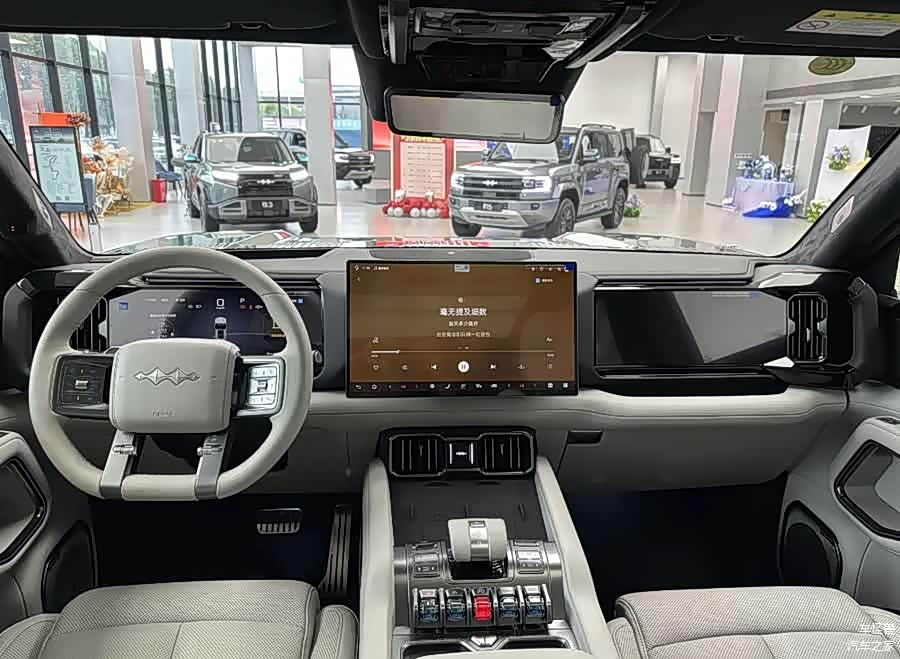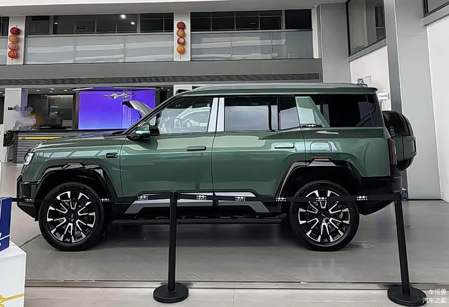 在外观设计上,大五座版继续采纳了“未来星舰美学”的设计哲学。车辆的前脸设计呈现出鲜明的硬派轮廓,两侧的贯穿式LED灯带形成了C字形的结构,与粗壮的前保险杠和车顶的三激光雷达相结合,共同营造出一种科技与力量共存的视觉体验。车辆的侧面设计维持了经典的“方盒子”形状,并加入了湖光绿色的车漆,以增强其个性识别能力,同时硬朗的线条也突出了其越野特质。在车辆的尾部设计中,中央位置的全尺寸外挂备胎被一块粗大的护板所覆盖,与厚实的后保险杠相结合,展现了一种硬朗的设计风格。垂直设计的尾灯组采纳了尖锐的棱角,并集成了智能驾驶提示功能的“小蓝灯”,以进一步提升其科技性能。