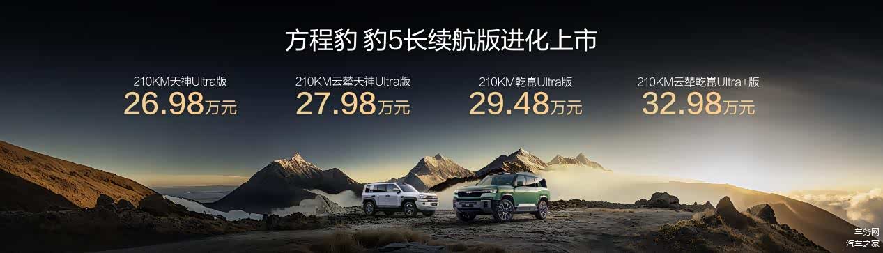 10月20日,方程豹汽车“ 豹5(图片 | 参数 | 询价)长续航版”焕新上市,价格26.98-32.98万元;豹8大五座版加推上市,价格37.98-40.78万元。方程豹以“人人可野·拥豹新生活”为核心主张,以豹5的10万台销量达成,以及品牌的20万台销量达成,宣告着电驱越野时代的全面到来。豹5持续蝉联硬派越野销量冠军,登顶“越野新王”,豹8则以引领40万级高端新能源SUV的姿态成为比亚迪华为联手打造的“稀缺旗舰”。本次方程豹豹系列产品,实现了DMO平台的DMO+升级、华为乾崑智驾的ADS 4升级、以及比亚迪智慧生态等多项顶级核心科技的全面升级,并带来续航、安全、舒适、操控等全维度的系统性优化,豹系列焕新引旷野出行。