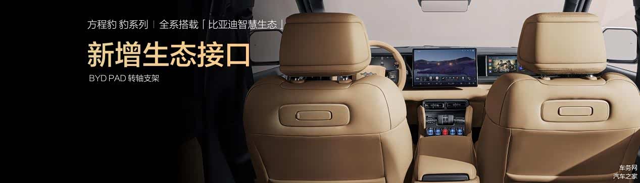 豹5长续航版、豹8大五座版上市即搭载钛7同款比亚迪智慧生态,通过生态设备的“全能管家”比亚迪智慧物联APP,无需复杂操作,也不需要手动连接多个设备,语音指令即能控制全车所有的生态产品。此外,两款新车型的前排座椅背后均加装了生态接口,插入转轴支架后,可以搭配BYD Pad使用。未来将有更多的生态产品,通过生态接口提供用户以智慧互联的无限体验。