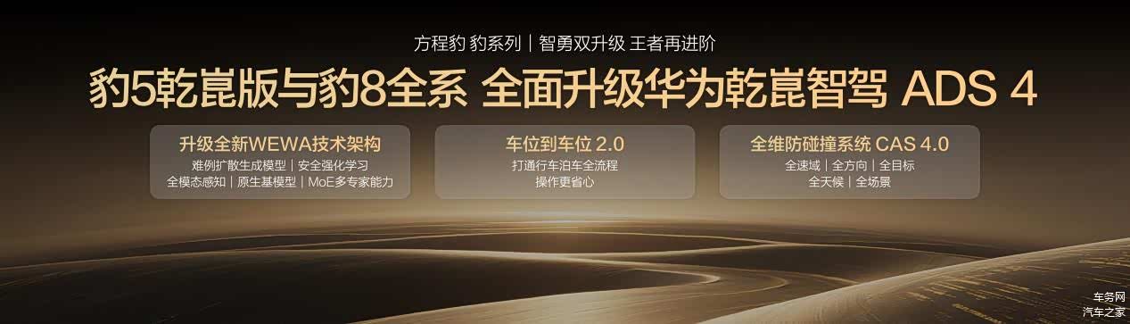 豹5乾崑版及豹8全系将升级华为乾崑智驾ADS 4,实现了从类人驾驶到超人驾驶的重大升级。首先,升级全新WEWA技术架构,让辅助驾驶可以云端自主学习进化,越用越丝滑;车位到车位功能也升级至2.0版本,打通了行车到泊车的全流程,全程衔接无缝,操作更省心;此外,还有全维防碰撞系统CAS 4.0,可以覆盖全路况、全天候,安全制动更快更灵敏,让长途驾驶不再疲惫,让城市通勤安全又轻松。