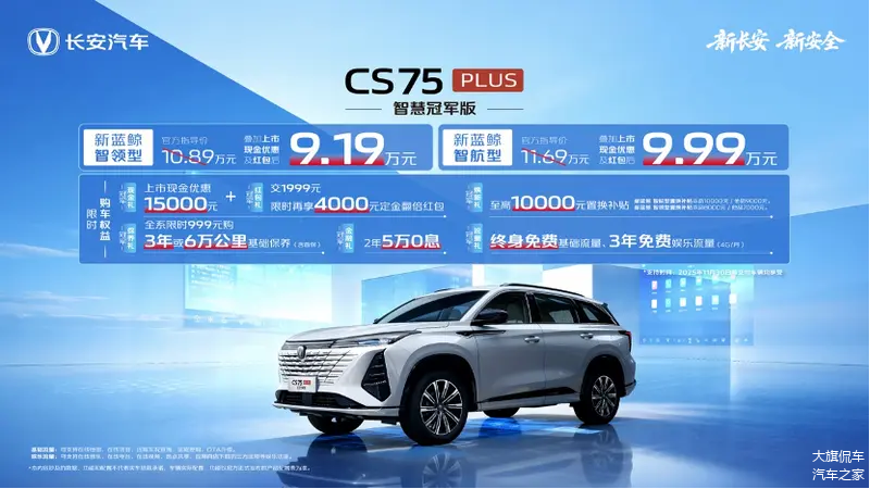 10月23日,长安CS75 PLUS智慧冠军版车型上市,新车推出2款配置车型,限时权益价9.19万元和9.99万元。实际上目前长安CS75 PLUS在售车型可以分为三代和四代两代产品,此次上市新车便是基于第三代长安CS75 PLUS所推出的版本车型。