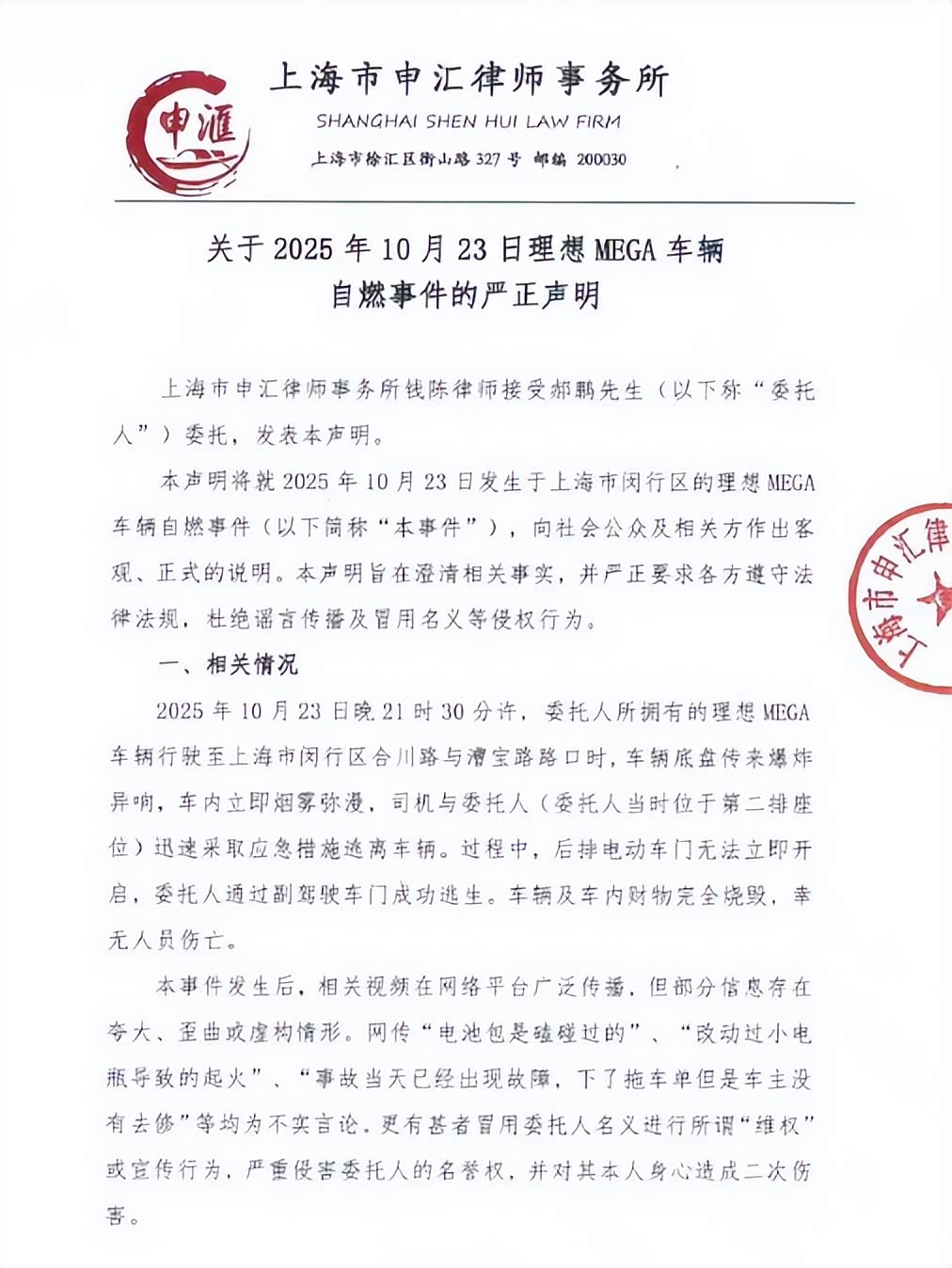 对此,车主倒是给出了一份律师函。从律师声明描述来看,上面所说的均为不实言论,而且关于事件的描述也很清楚,在车辆底盘传来爆炸异响后,车内立即烟雾弥漫,司机与委托人(当时位于第二排座位)迅速采取应急措施逃离车辆。过程中,后排电动车门无法立即开启,委托人通过副驾驶车门成功逃生。