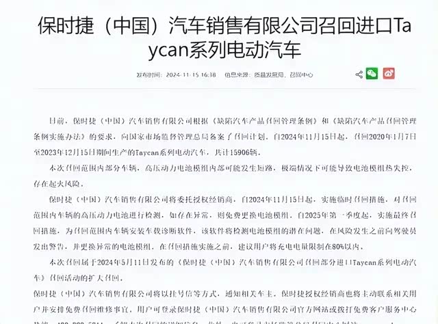 相比于小米和理想,保时捷Taycan则发生过多次高压电池召回事件,包括2023年10月、2024年5月和2024年11月。其中2024年11月这次涉及15906辆汽车,召回范围内的部分车辆,高压动力电池模组内部可能发生短路,极端情况下可能导致电池模组热失控,存在起火风险。