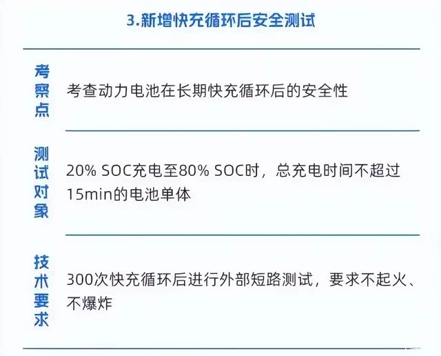 第三是新增了快充循环后短路测试,要求300次快充循环后进行外部短路测试,不起火、不爆炸。