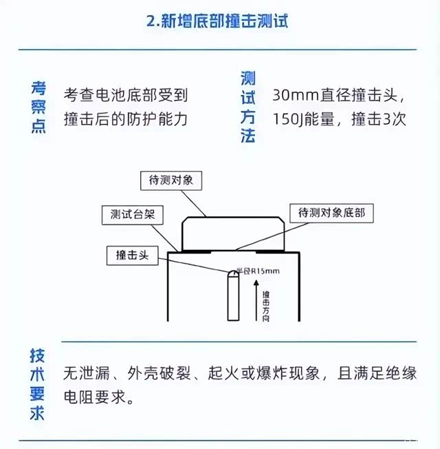 第二是新增了底部撞击测试,要求电池底部受到撞击后,无泄漏、外壳破裂、起火或爆炸现象,且满足绝缘电阻要求。