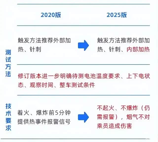 相比于2020版,新国标主要增加了三个内容。第一个是将热扩散测试技术要求从“着火、爆炸前5分钟提供热事件报警信号”,修改为“不起火、不爆炸(仍需报警),烟气不对乘员造成伤害”。