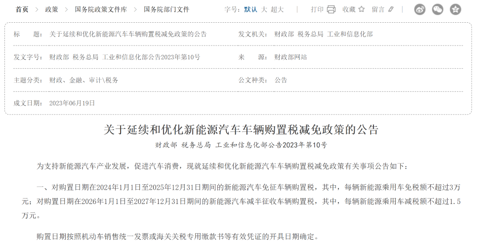 ▲《关于延续和优化新能源汽车车辆购置税减免政策的公告》