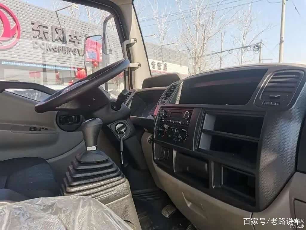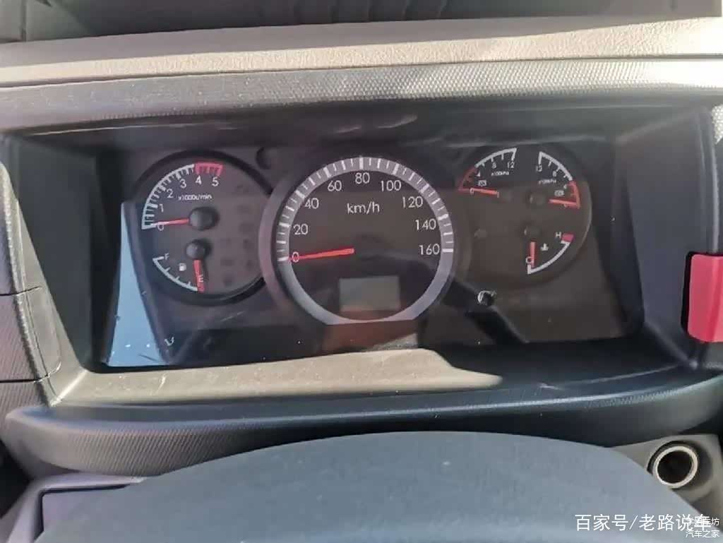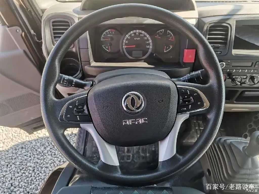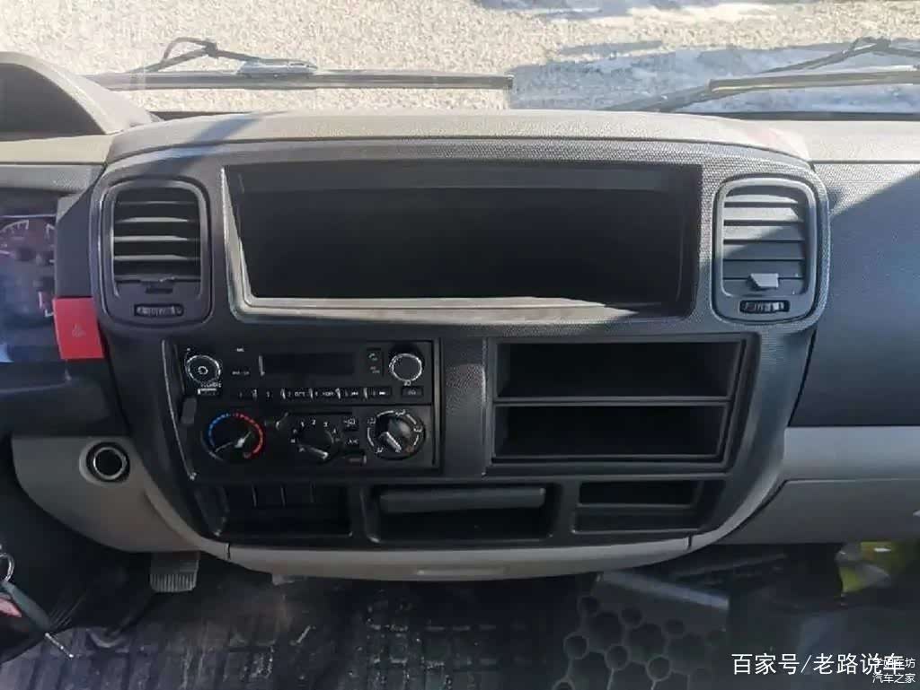 四幅式多功能方向盘小巧美观,配合银色饰板,看上去有乘用车的观感,在“3点9点”处有内凹设计,方便抓握。两侧功能区集成了定速巡航、多媒体音量调节、曲目切换、蓝牙电话等功能,方便驾驶员手不离方向盘进行操作。仪表盘采用对称式设计,多个指针仪表便于驾驶员及时了解车辆状况。红色双闪警示灯开关被巧妙的设置在仪表盘右侧边框上,触手可及,操作便利。此外,在仪表盘上方还配备了一个尺寸很深的储物槽,其斜坡设计很实用,即便是急加速、急刹车其中物品也不会散落出来。