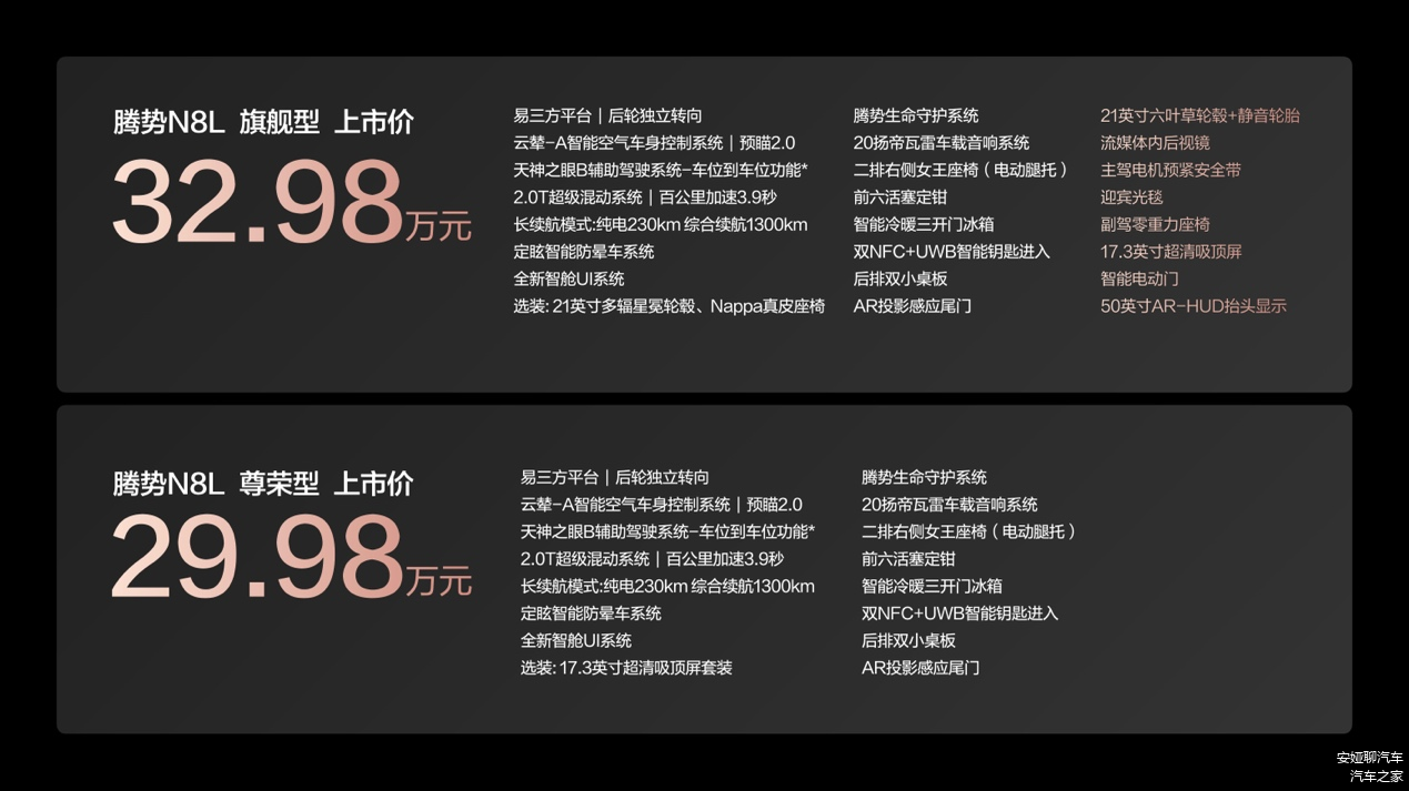 腾势总经理李慧用三句话总结N8L,就是:超安全家庭大六座、超豪华移动大平层、超智能科技大座驾,以硬核技术实力重塑家庭大六座豪华SUV新标准,与每个热爱生活的家庭一起奔赴美好。