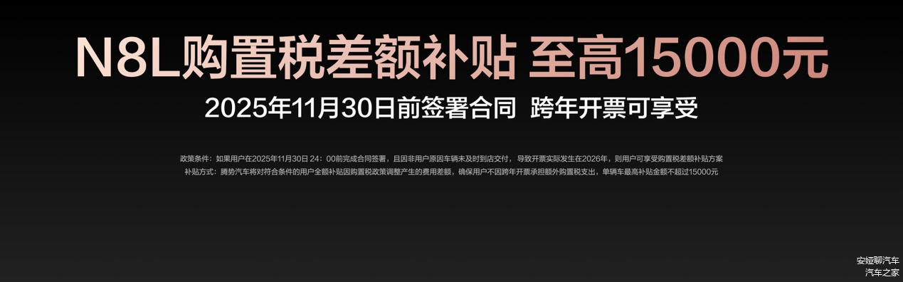 为回馈广大用户的支持与信赖,腾势N8L特别推出限时购车权益,权益价值至高10.67万元!包括价值1.7万元的三年免息,最高1万元的置换补贴。此外,不必担心因为交车晚,享受不到购置税补贴:在2025年11月30日24点前完成合同签署的用户,如果因非用户原因车辆未及时交付,导致开票实际发生在2026年,可享受购置税差额补贴,最高1.5万元!