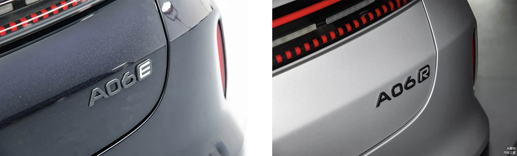 外观走简洁路线。贯穿式灯组配双层布局,车标能发光,车侧用半隐藏门把手配无框车门。纯电版尾标A06E增程版是A06R,两个版本外观基本一致。掀背造型兼顾了轿车流线和实用性,视觉效果比三厢车年轻。