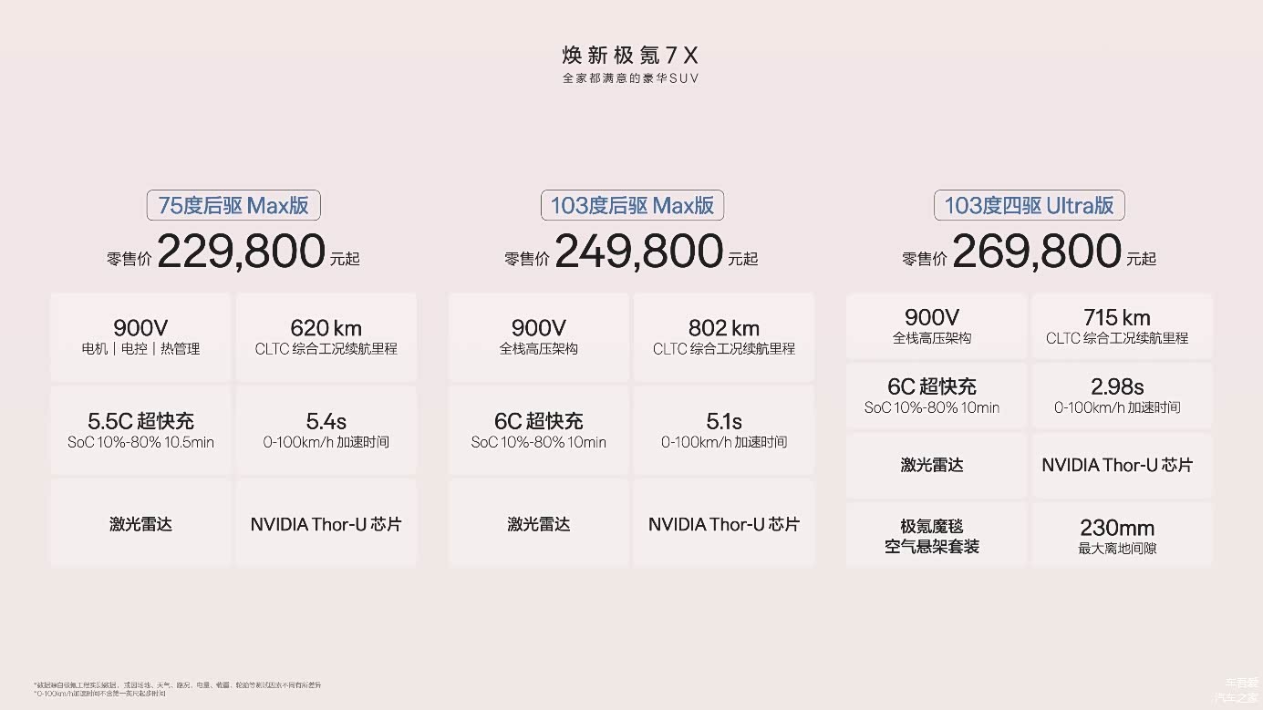 焕新极氪7X在高价值、好口碑的基础上,在空间、性能、安全、智能四大维度豪华进阶,全系搭载900V电机、电控及热管理系统,全系标配5.5C或6C超快充,全系标配激光雷达及算力高达700TOPS的Thor-U辅助驾驶芯片,全系标配137项豪华配置,重塑全球家庭豪华SUV新标杆。