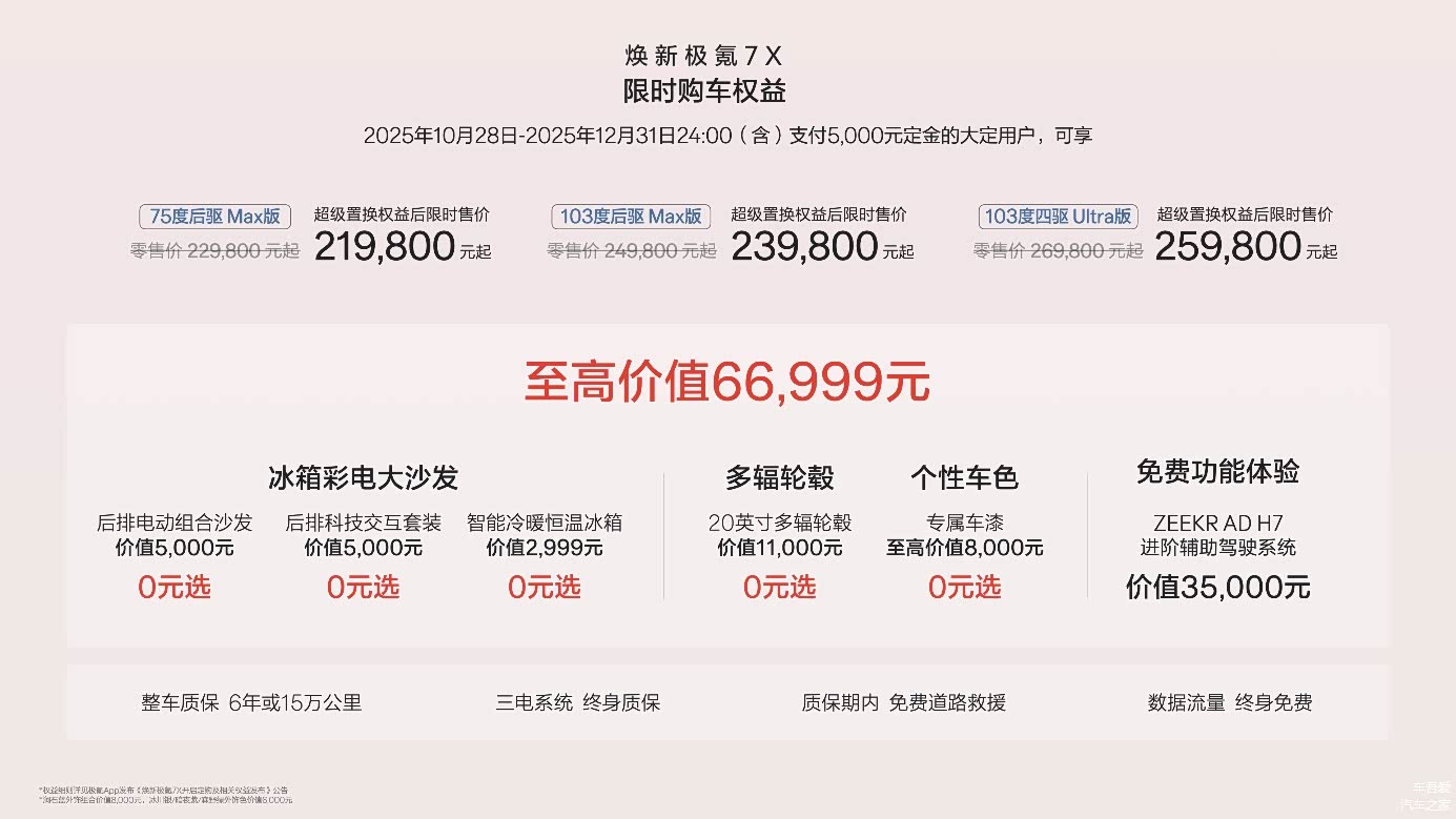 2025年10月28日至12月31日(含)期间支付5,000元定金的大定用户,全系赠送价值12,999元的冰箱彩电大沙发,全系免费升级20英寸265mm宽胎以及专属车漆,并可享价值35,000元的ZEEKRAD H7进阶辅助驾驶系统终身免费功能体验。与此同时,首任极氪老车主增换购焕新极氪7X可享每年1000度的5年免费充电权益。此外,2025年11月30日(含)前,下定且锁单的用户,如因极氪原因,无法在2025年开票交付,导致无法全额享受购置税优惠,对于政策退坡产生的差额,极氪品牌提供至高13,500元的购车尾款抵扣。