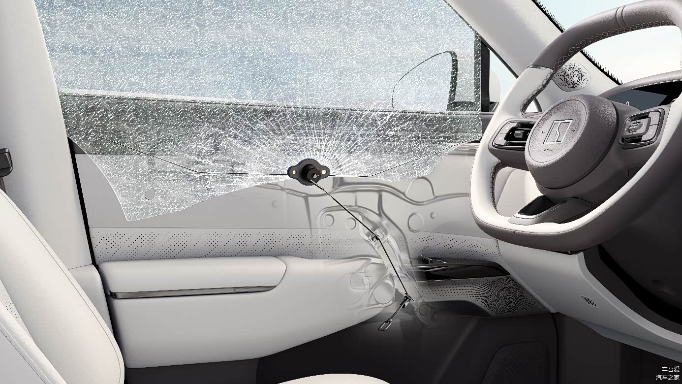 值得一提的是,区别于普通双层夹胶玻璃,焕新极氪7X采用外层3.5mm钢化玻璃+0.76mmPVB胶膜+ 内层1.1mm钢化玻璃的设计,表层压应力和内部张应力形成力学平衡,主驾安全破窗器可以轻松击穿。