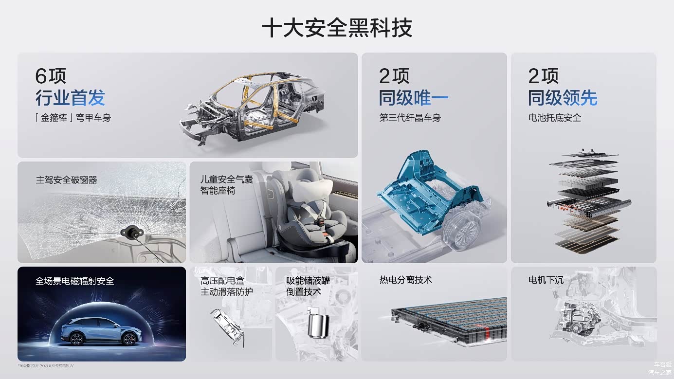 焕新极氪7X带来10项安全黑科技,其中包括6项行业首发、2项同级唯一和2项同级领先的安全技术,涵盖「金箍棒」穹甲车身、主驾安全破窗器、吸能储液罐倒置、高压配电盒主动滑落防护、热电分离、电机下沉等行业领先技术,结合一体式压铸后端铝车身,构筑起720°全方位安全盔甲,进一步巩固极氪式安全理念,为家庭出行铸就「移动安全堡垒」。