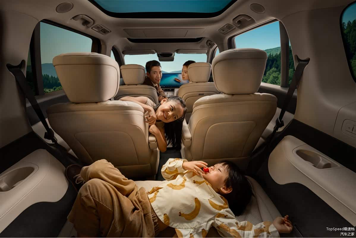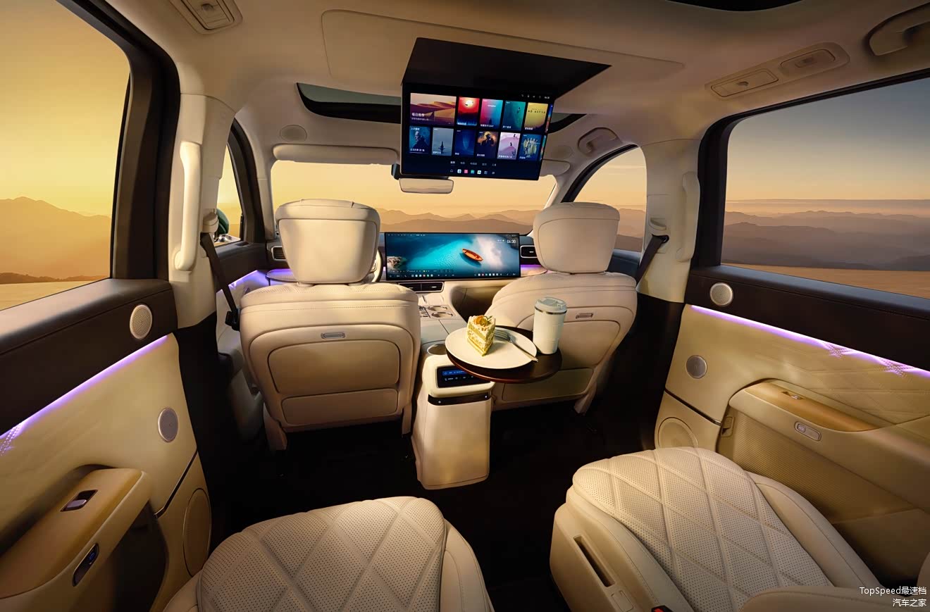 空间与舒适配置上,车辆车身尺寸为5205*1998*1800mm,轴距3120mm,采用六座独立布局。二排腿部空间达1022mm,第三排配备全电动座椅,身高1.9米的乘客乘坐时可保持舒展姿态。座舱内有17㎡皮质工艺包覆,全系标配全车静音玻璃和静音轮胎,配合ENC主动降噪技术提升乘坐静谧性。此外,车辆提供1590L超大后备箱和40处储物空间,支持一键语音解锁1.8m大床模式,适配露营等多场景需求。