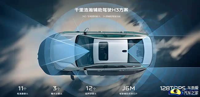 辅助驾驶方面,吉利银河星耀6顶配车型搭载千里浩瀚H3辅助驾驶系统,配备3个毫米波雷达、11个内外摄像头、12个超声波雷达,搭载地平线征程J6M芯片,算力128 Tops,可实现城市通勤NOA、高速NOA等辅助驾驶功能,支持大车避让、变道、语音&拨杆变道、上下匝道等功能。高配车型还配备透明底盘/540度影像。同时,新车还将支持支持120km/h紧急刹停技术、130km/h紧急避让技术,误加速抑制系统可实现当系统判断车主无意误踩油门时,它将自动限制加速输出,从而避免因驾驶失误引发的意外。