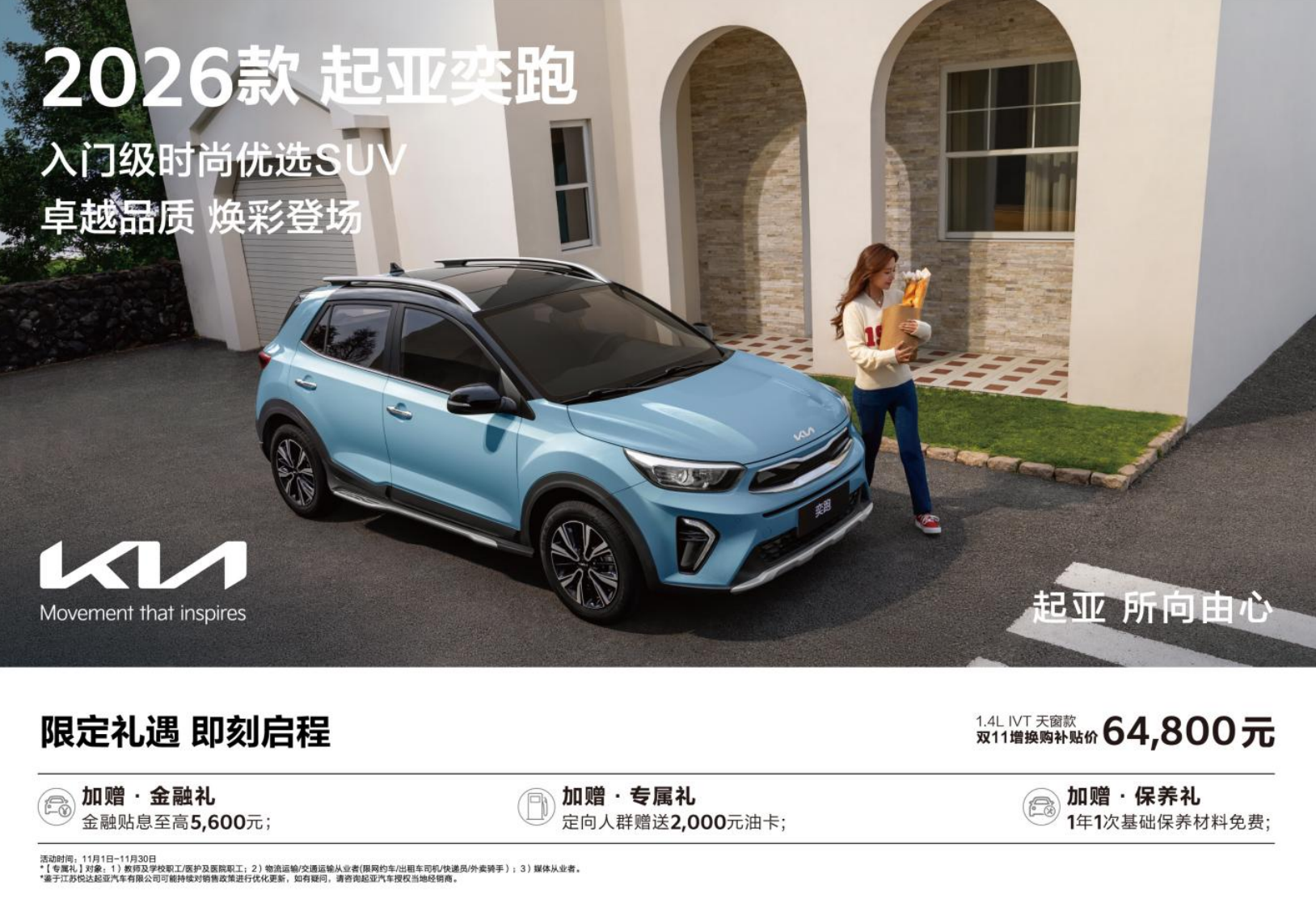 小型SUV市场迎来新竞争者,2026款 起亚奕跑(图片 | 参数 | 询价)以全球品质与亲民价格瞄准年轻用户。11月1日,起亚全球高品质SUV——2026款起亚奕跑正式焕新上市。新车共推出2款车型,主打年轻用户市场,其中1.4L IVT天窗款双11增换购补贴价仅为6.48万元。