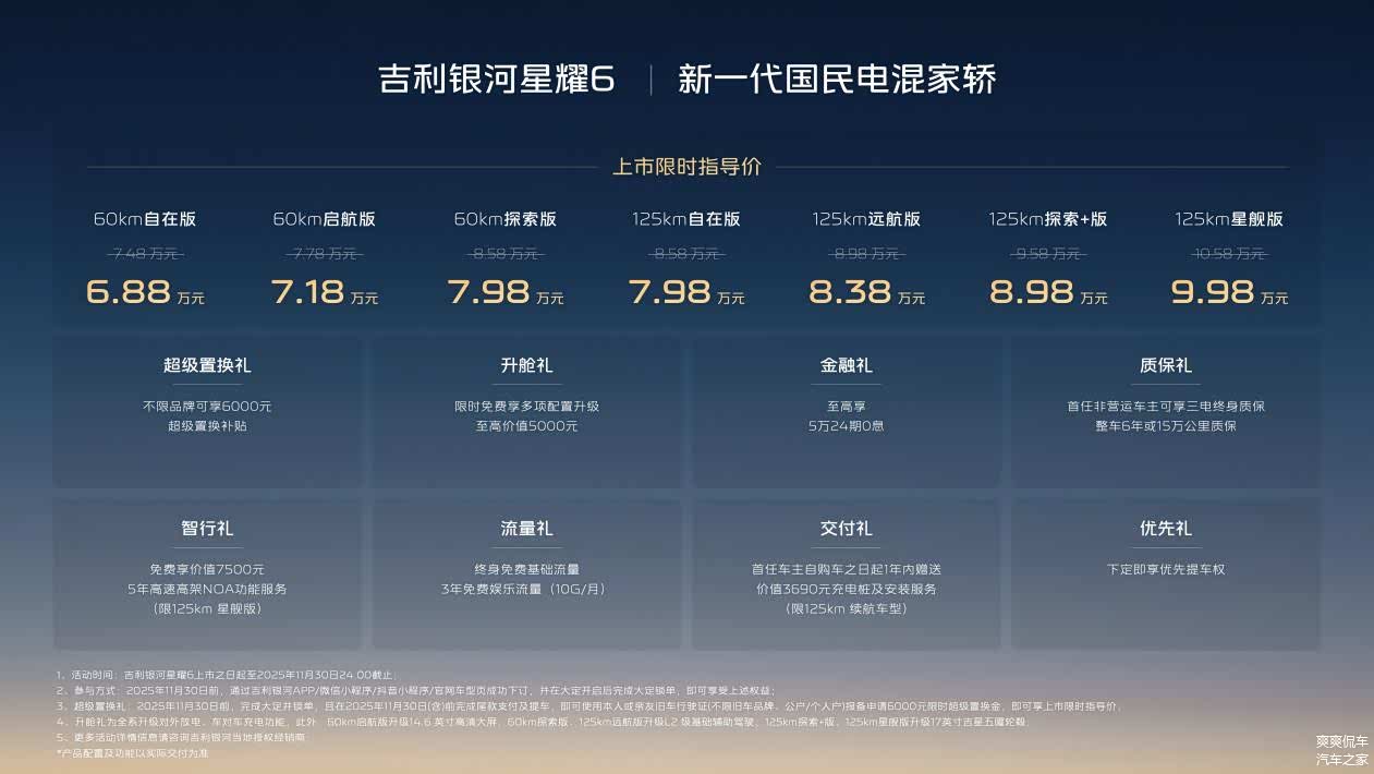 10月30号,吉利银河星耀6这款新的国民电混家轿全球上市啦。这车有7种不同的款式,分别是60km自在版、60km启航版、60km探索版、125km自在版、125km远航版、125km探索+版、125km星舰版,上市的时候限时指导价是6.88万元到9.98万元。