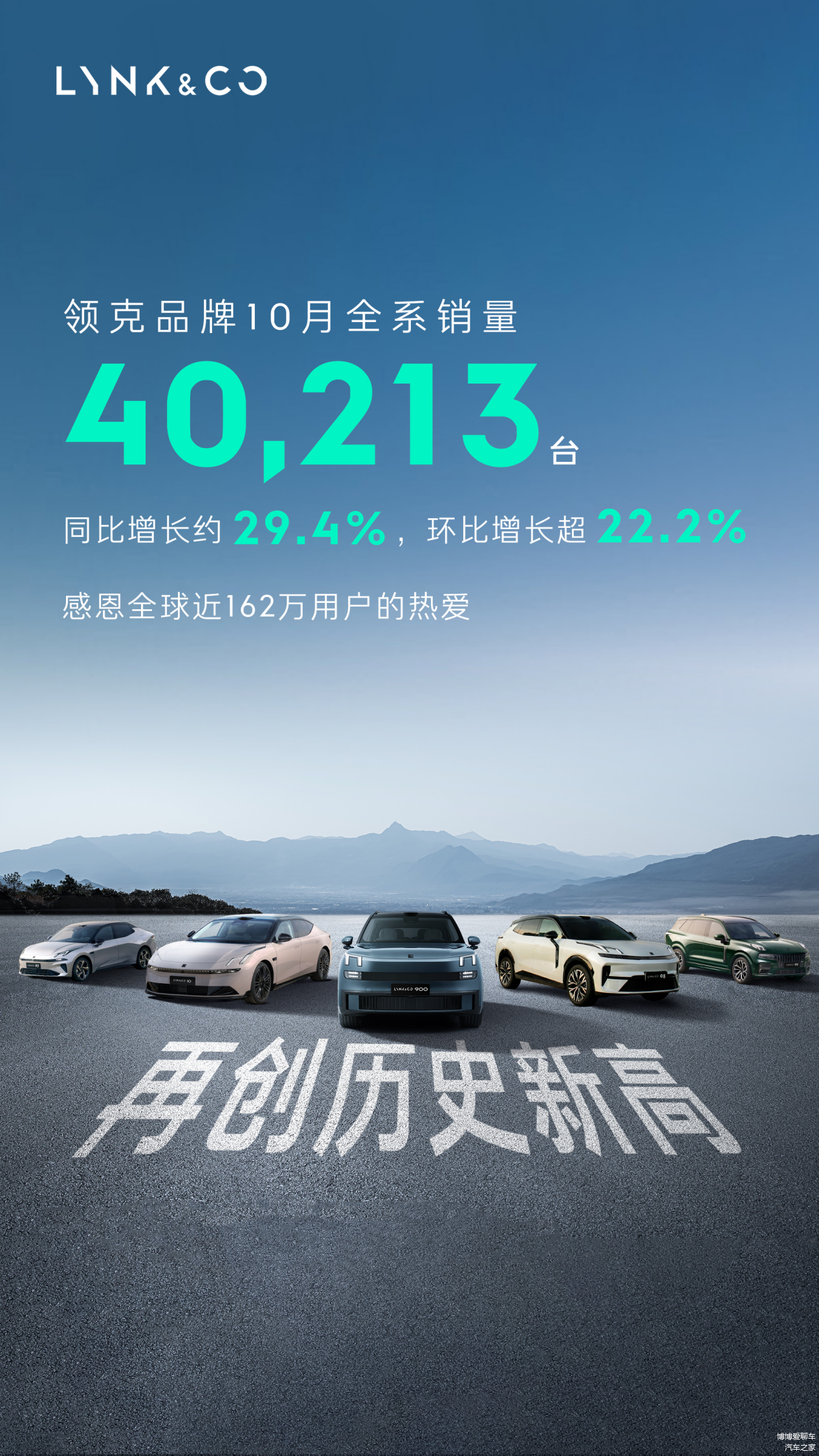 从首台车型交付到累计销量近162万台,从本土市场深耕到全球化版图拓展,领克的每一步成长,都离不开用户的支持与信赖。10月的“量价双升”,是过去积累的成果,更是未来前行的起点。未来,我们相信领克将陪伴更多用户开启美好的出行生活,也为中国汽车工业的发展书写更多精彩篇章。