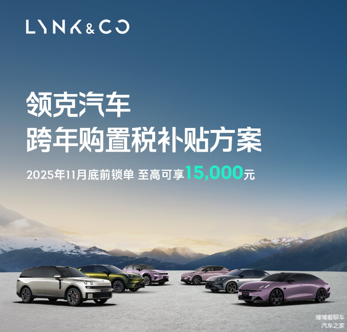 为感谢用户的信任与支持,消除用户担心因跨年开票及交付可能导致的购置税优惠减少的顾虑,领克特别推出“跨年购置税补贴方案”政策。新能源车型:在2025年11月30日24点前完成大定锁单,如因生产或发运导致开票时间延至2026年,从而影响实际享受到的购置税优惠,领克将主动补足差额,单台车最高补贴15,000元。燃油车型:11月1日至11月30日期间,购买领克01焕新版、第三代领克03、领克06 Relive、领克09四驱探索版等指定车型,可享至高15,000元购置税补贴(尾款直减),加油、保险礼遇同步加持,购车成本更可控。